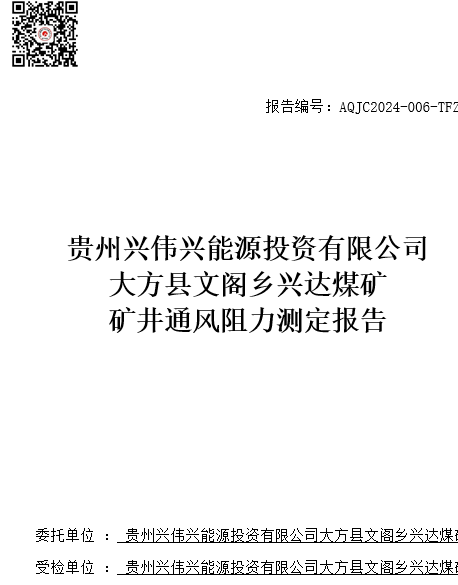 大方縣文閣鄉興達煤礦礦井通風阻力測定報告