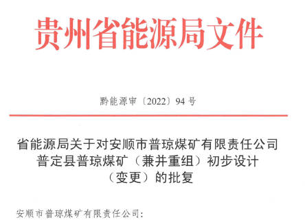 安順市普瓊煤礦有限責任公司普定縣普瓊煤礦(兼并重組)初步設計(變更)