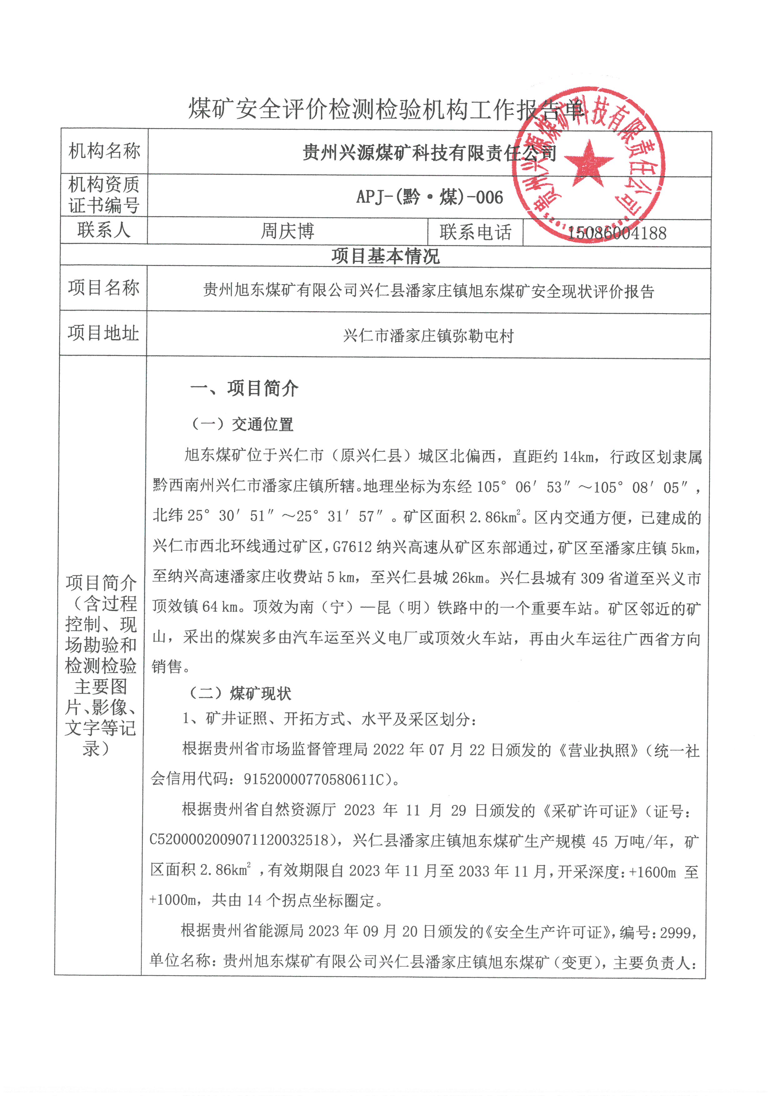 煤礦安全評價檢測檢驗機構工作報告單【貴州旭東煤礦有限公司興仁縣潘家莊鎮旭東煤礦安全現狀評價報告】