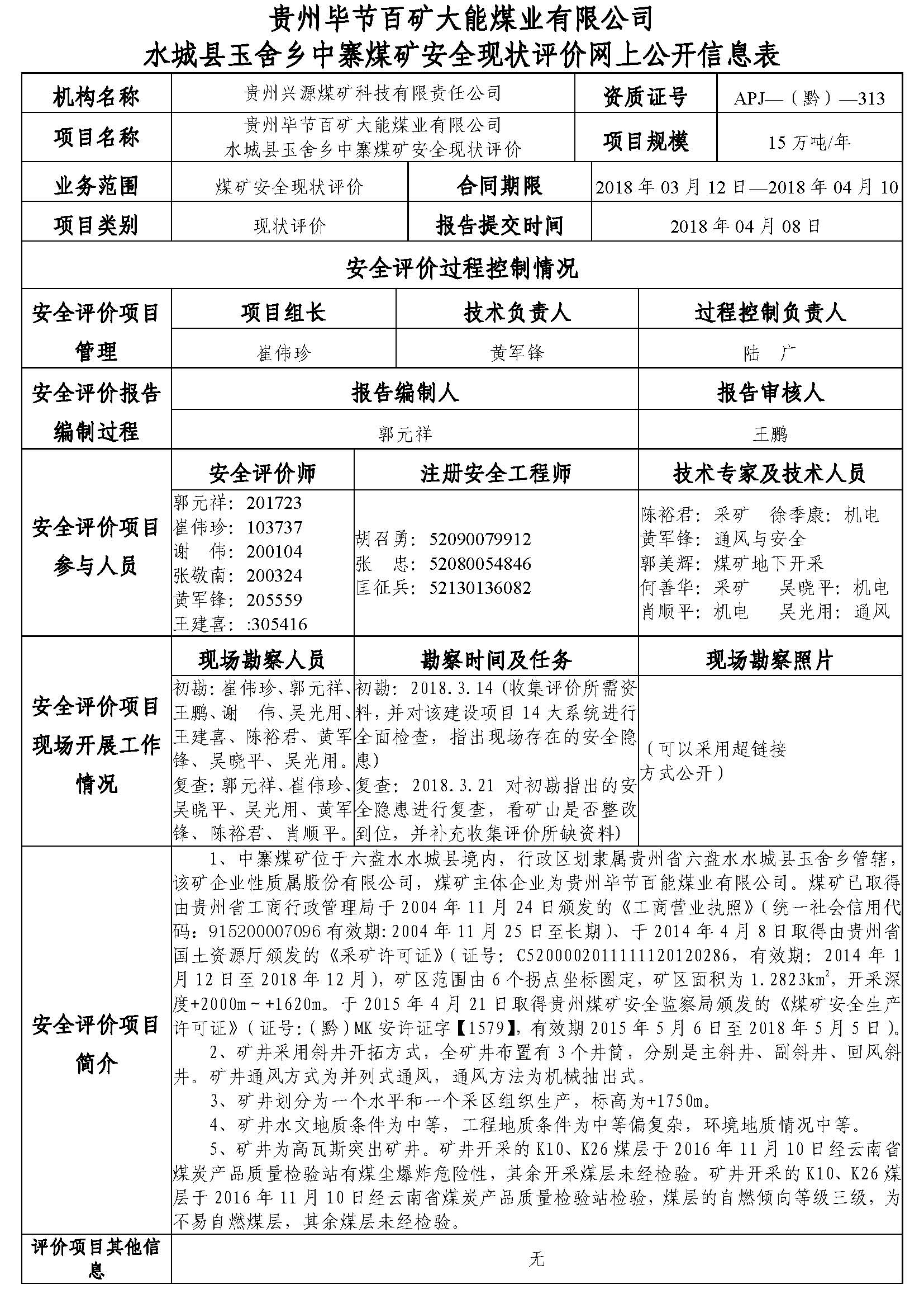貴州畢節百礦大能煤業有限公司水城縣玉舍鄉中寨煤礦安全現狀評價網上公開信息表