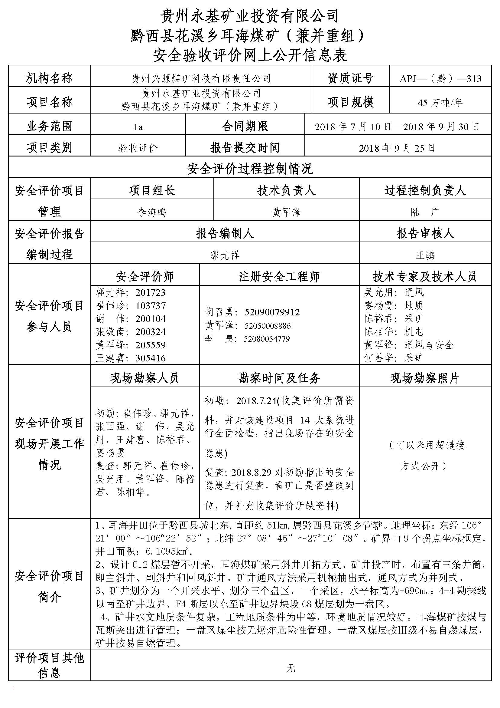 貴州永基礦業(yè)投資有限公司黔西縣花溪鄉(xiāng)耳海煤礦(兼并重組)安全驗(yàn)收評(píng)價(jià)網(wǎng)上公開(kāi)信息表
