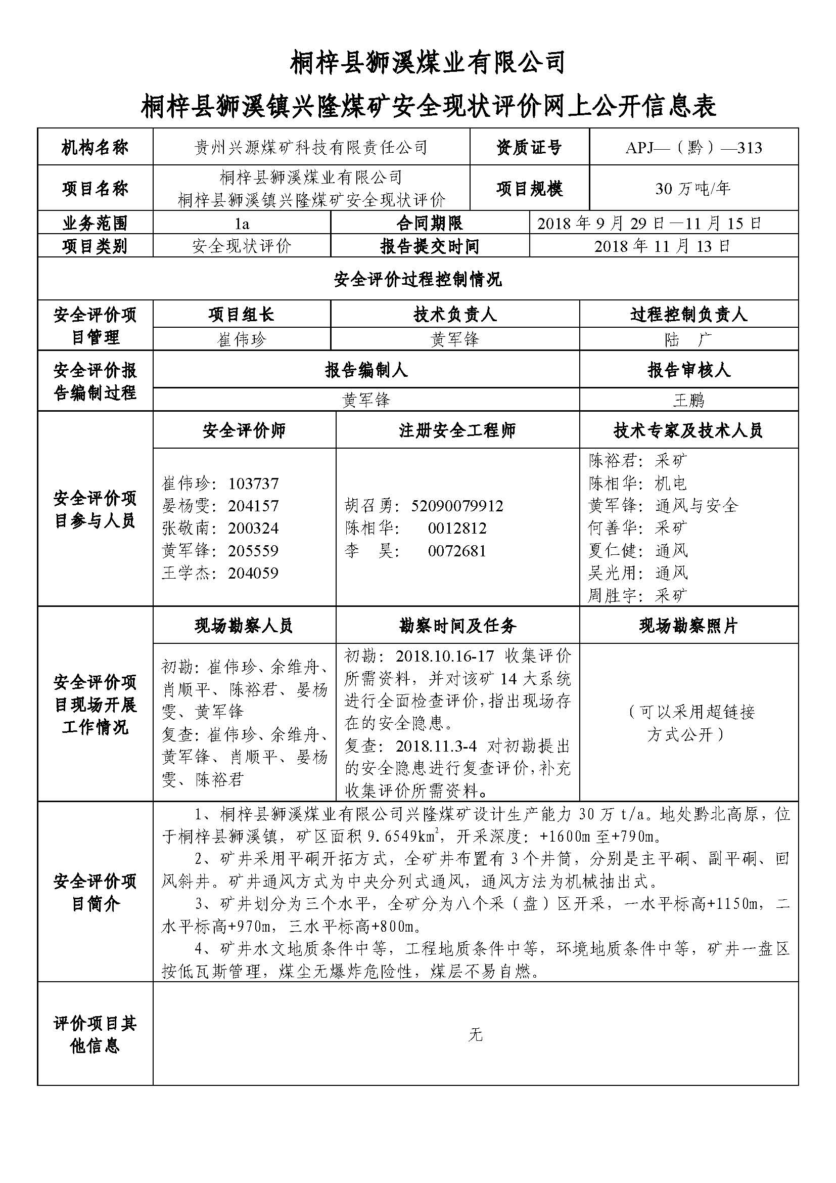 桐梓縣獅溪煤業(yè)有限公司桐梓縣獅溪鎮(zhèn)興隆煤礦安全現(xiàn)狀評(píng)價(jià)網(wǎng)上公開信息表