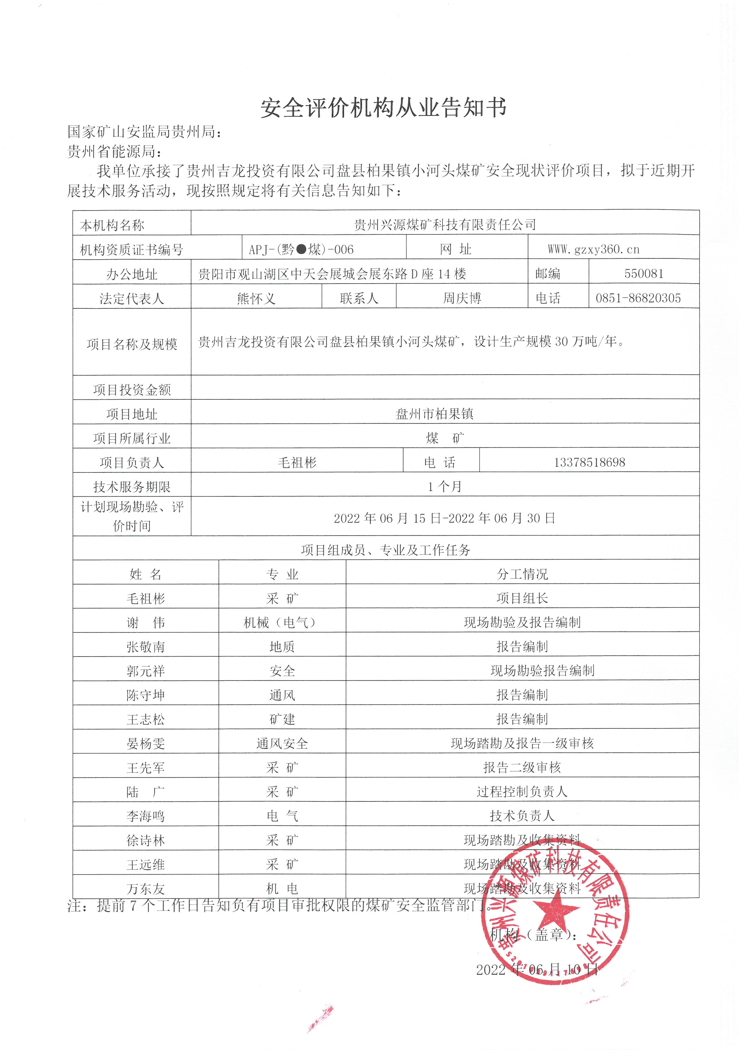 安全評價機構從業告知書(貴州吉龍投資有限公司盤縣柏果鎮小河頭煤礦安全現狀評價)