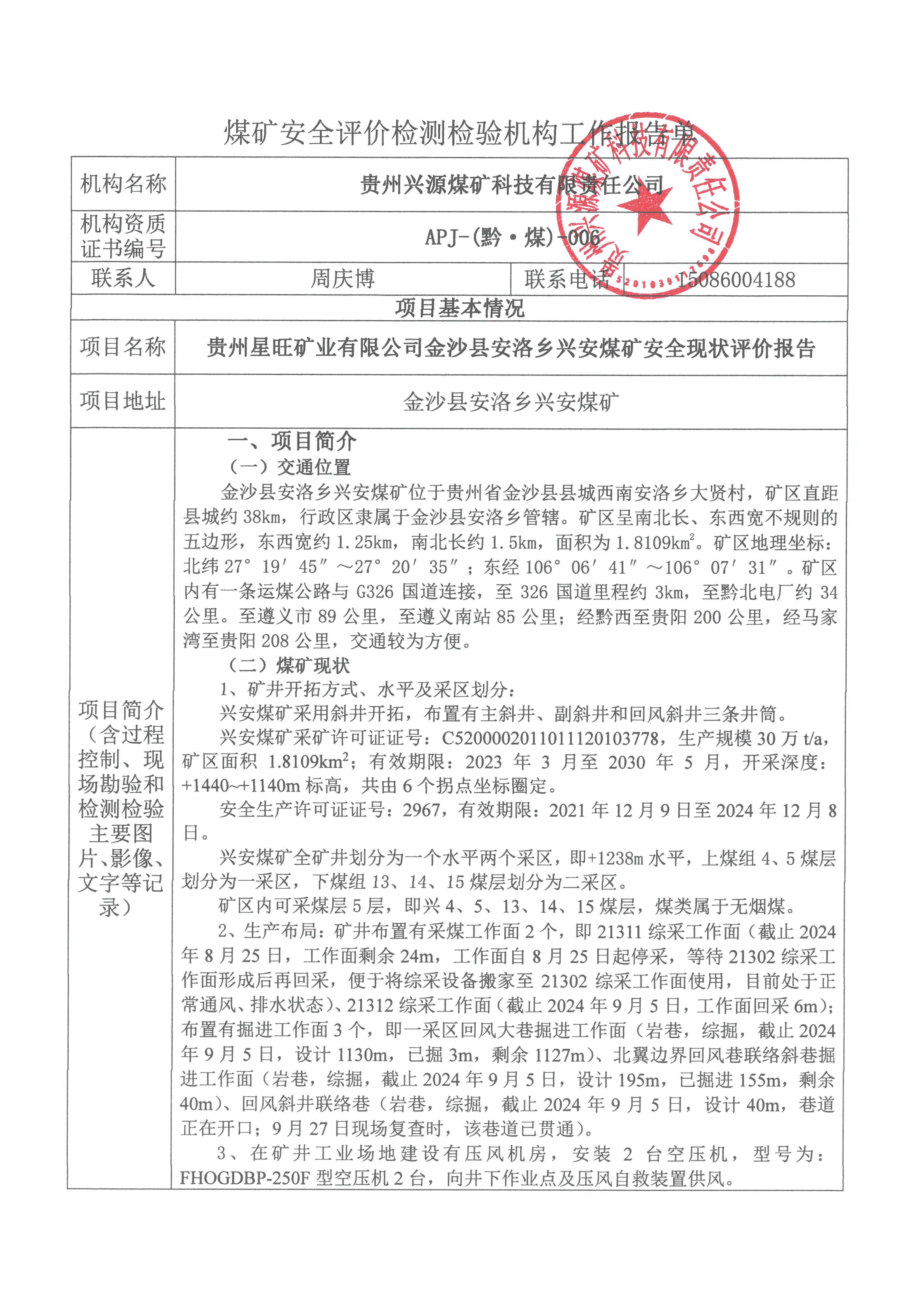煤礦安全評價檢測檢驗機構工作報告單【貴州星旺礦業有限公司金沙縣安洛鄉興安煤礦安全現狀評價報告】