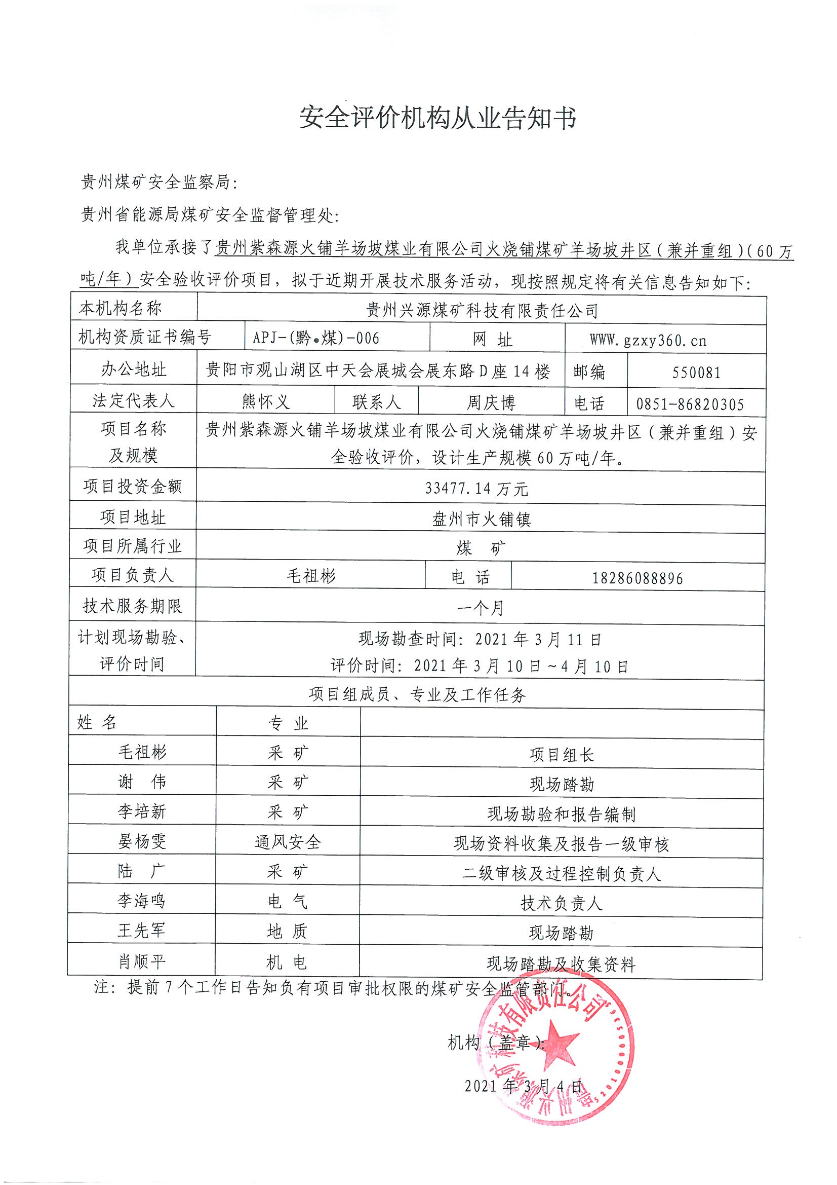 安全評價機構從業告知書(貴州紫森源火鋪羊場坡煤業有限公司火燒鋪煤礦羊場坡井區(兼并重組)(60萬噸年)安全驗收評價)