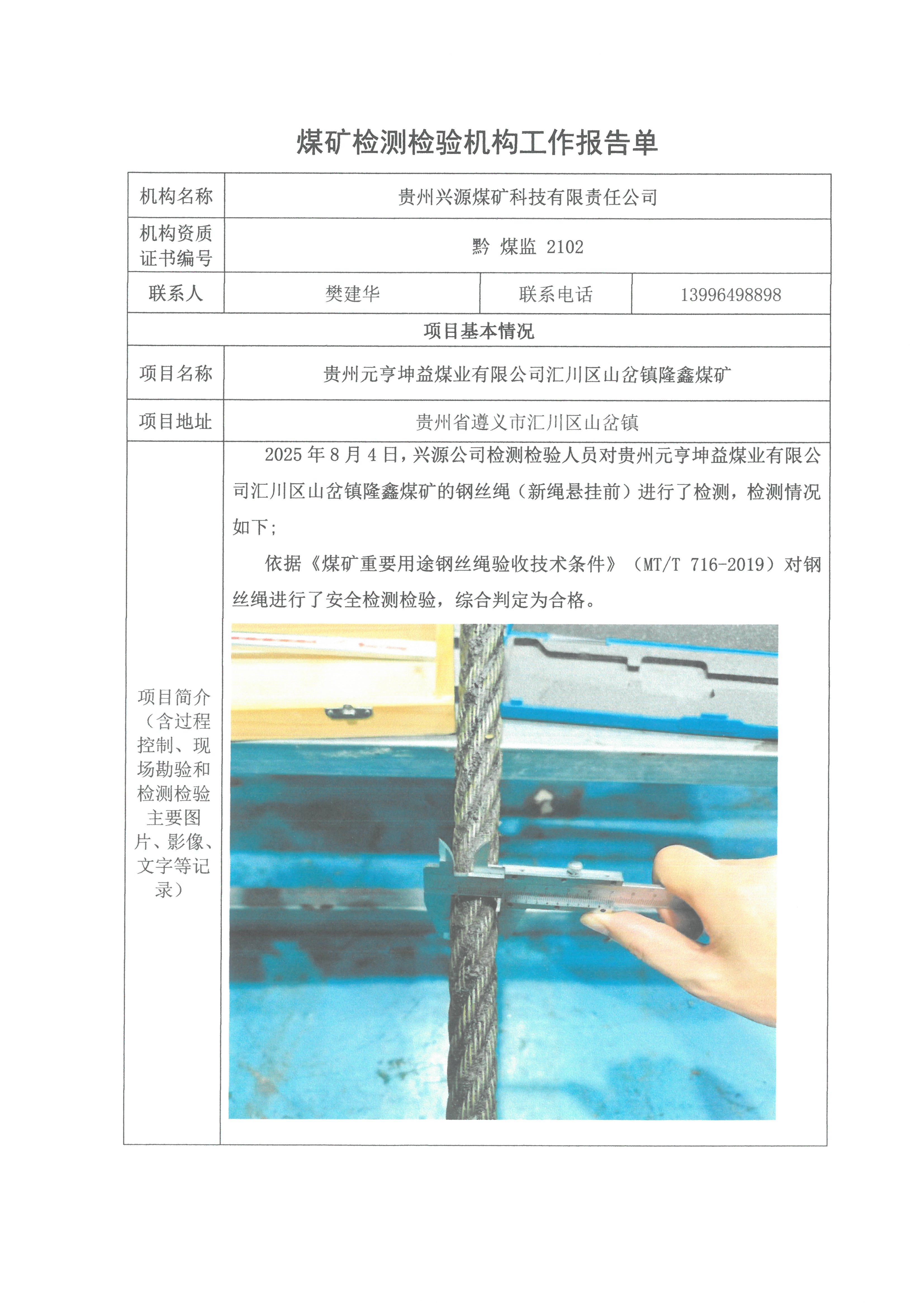 煤礦檢測檢驗機構工作報告單【貴州元亨坤益煤業有限公司匯川區山岔鎮隆鑫煤礦】