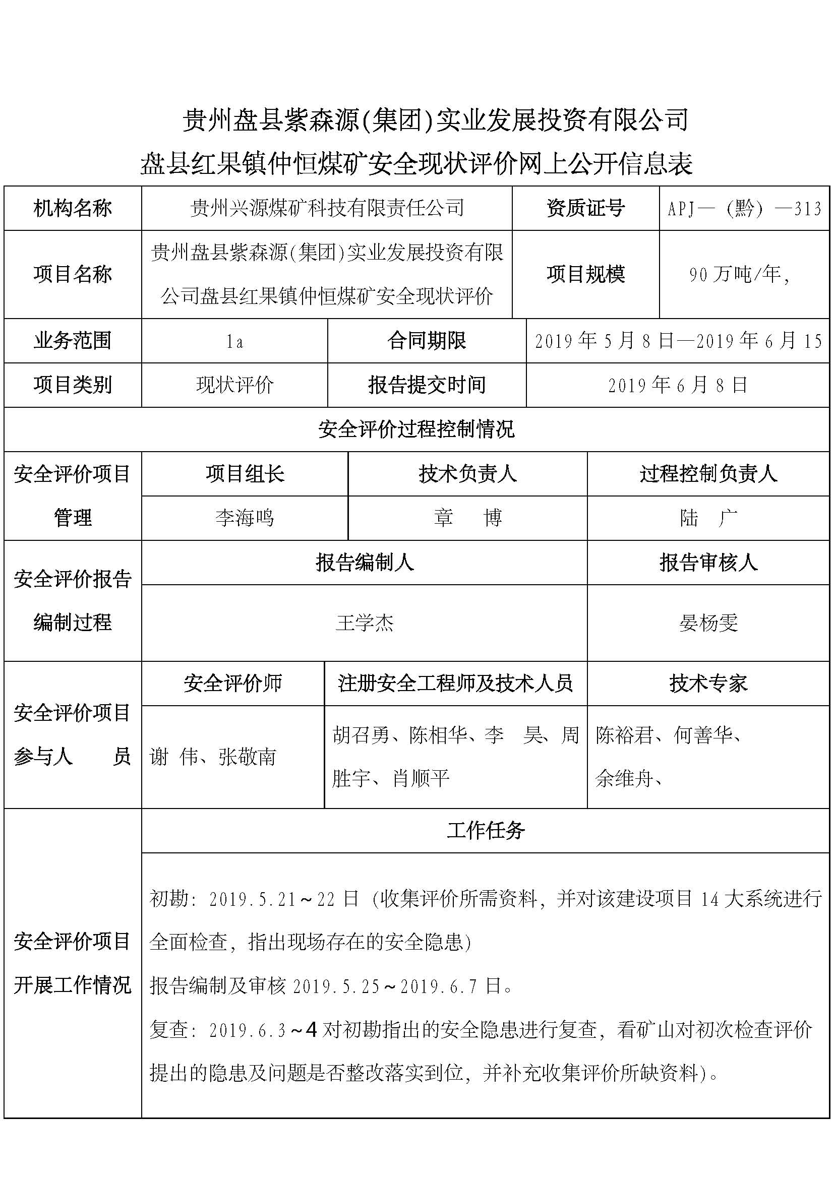 貴州盤縣紫森源(集團)實業發展投資有限公司盤縣紅果鎮仲恒煤礦安全現狀評價網上公開信息表