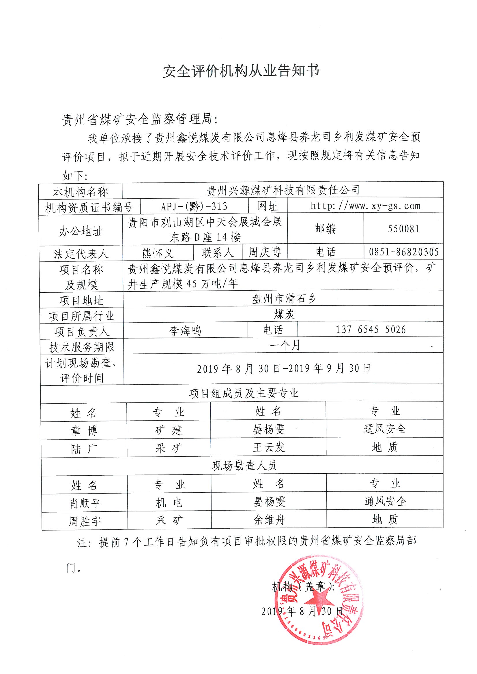 安全評價機構從業告知書【貴州鑫悅煤炭有限公司息烽縣養龍司鄉利發煤礦】