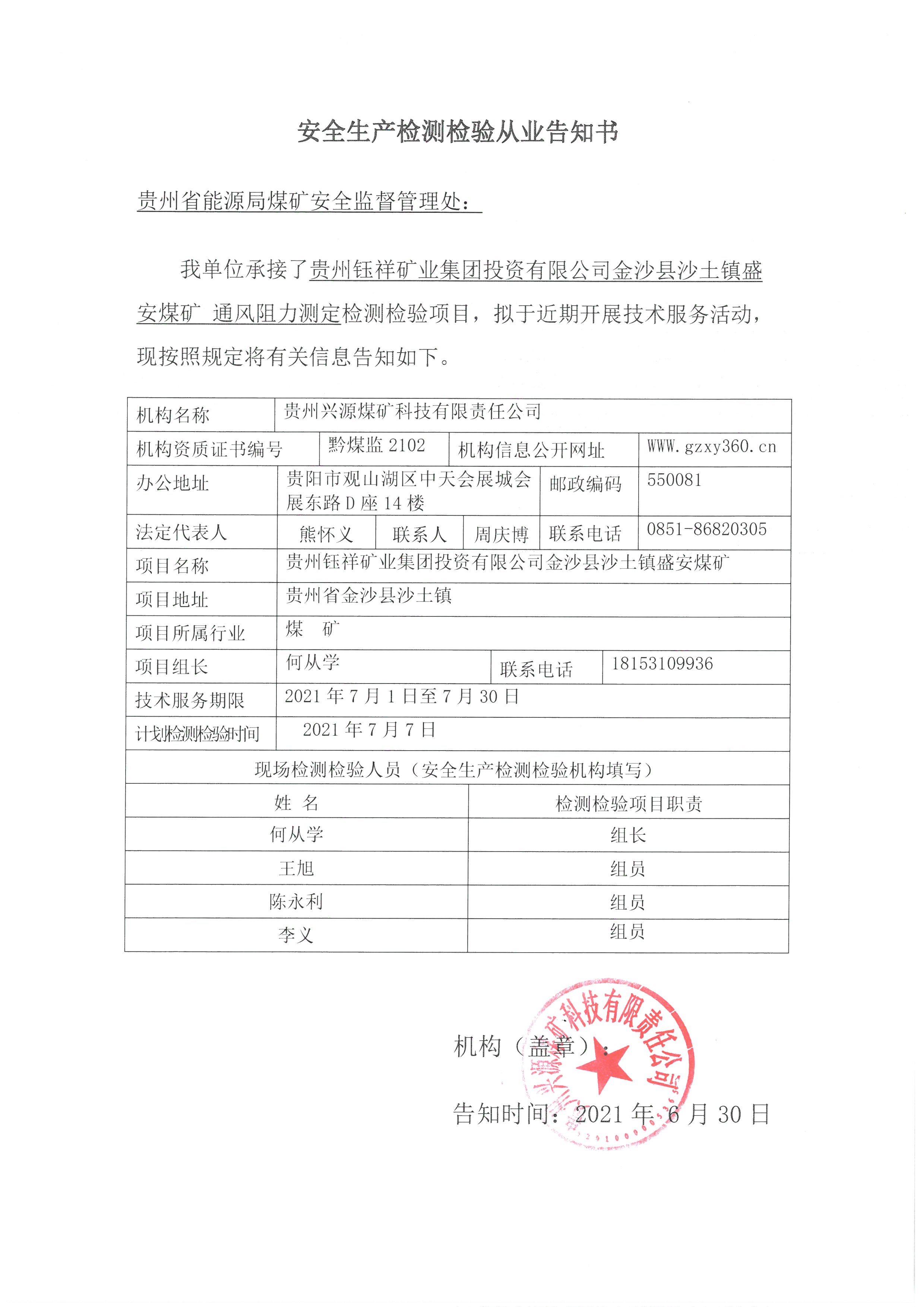 安全生產檢測檢驗從業告知書【貴州鈺祥礦業集團投資有限公司金沙縣沙土鎮盛安煤礦】
