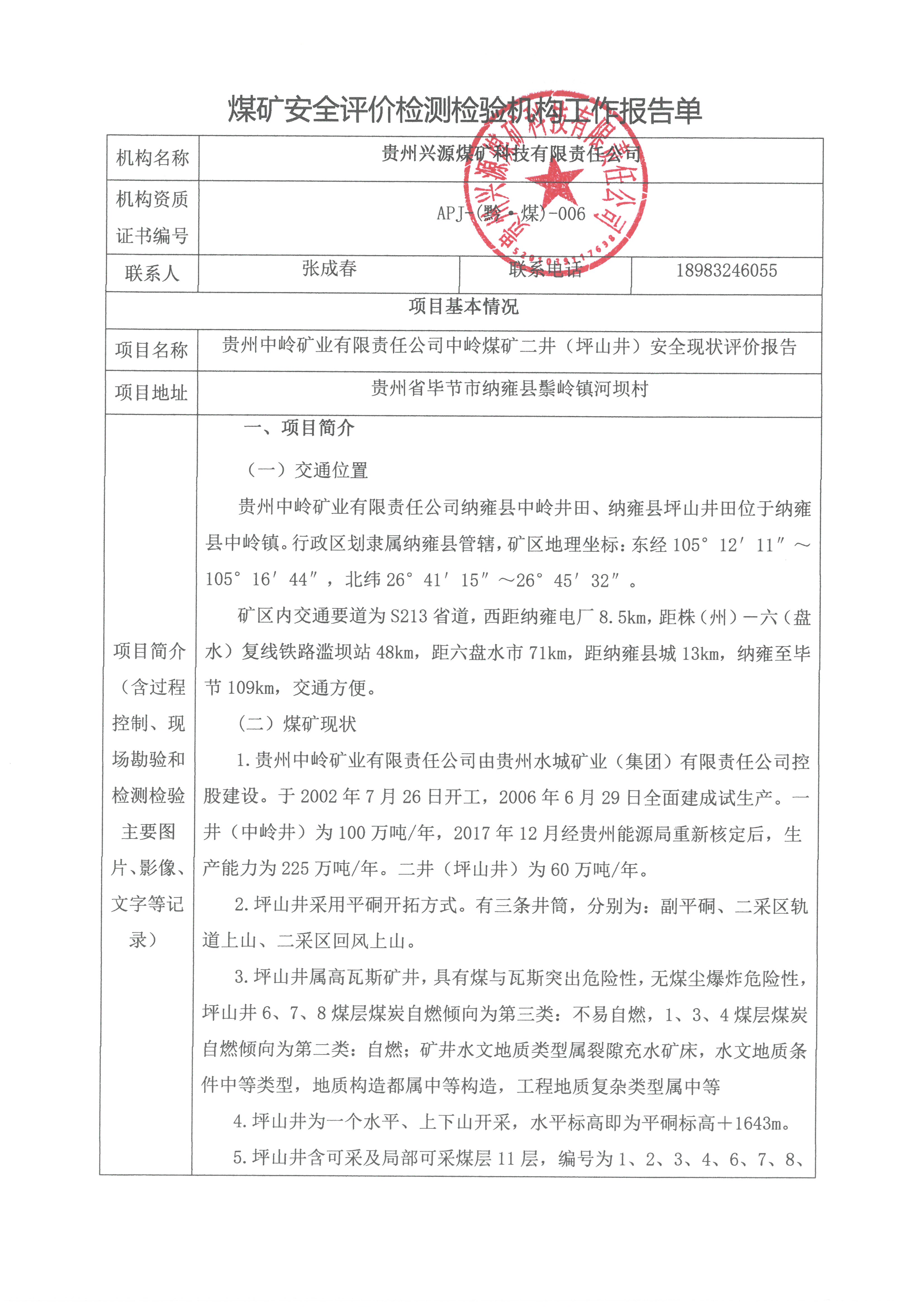 煤礦安全評價檢測檢驗機構工作報告單【貴州中嶺礦業有限責任公司中嶺煤礦二井(坪山井)安全現狀評價報告】