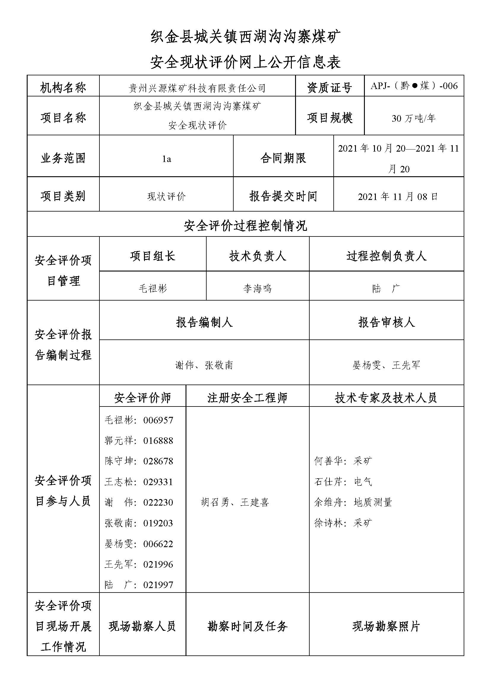 織金縣城關鎮西湖溝溝寨煤礦安全現狀評價網上公開信息表
