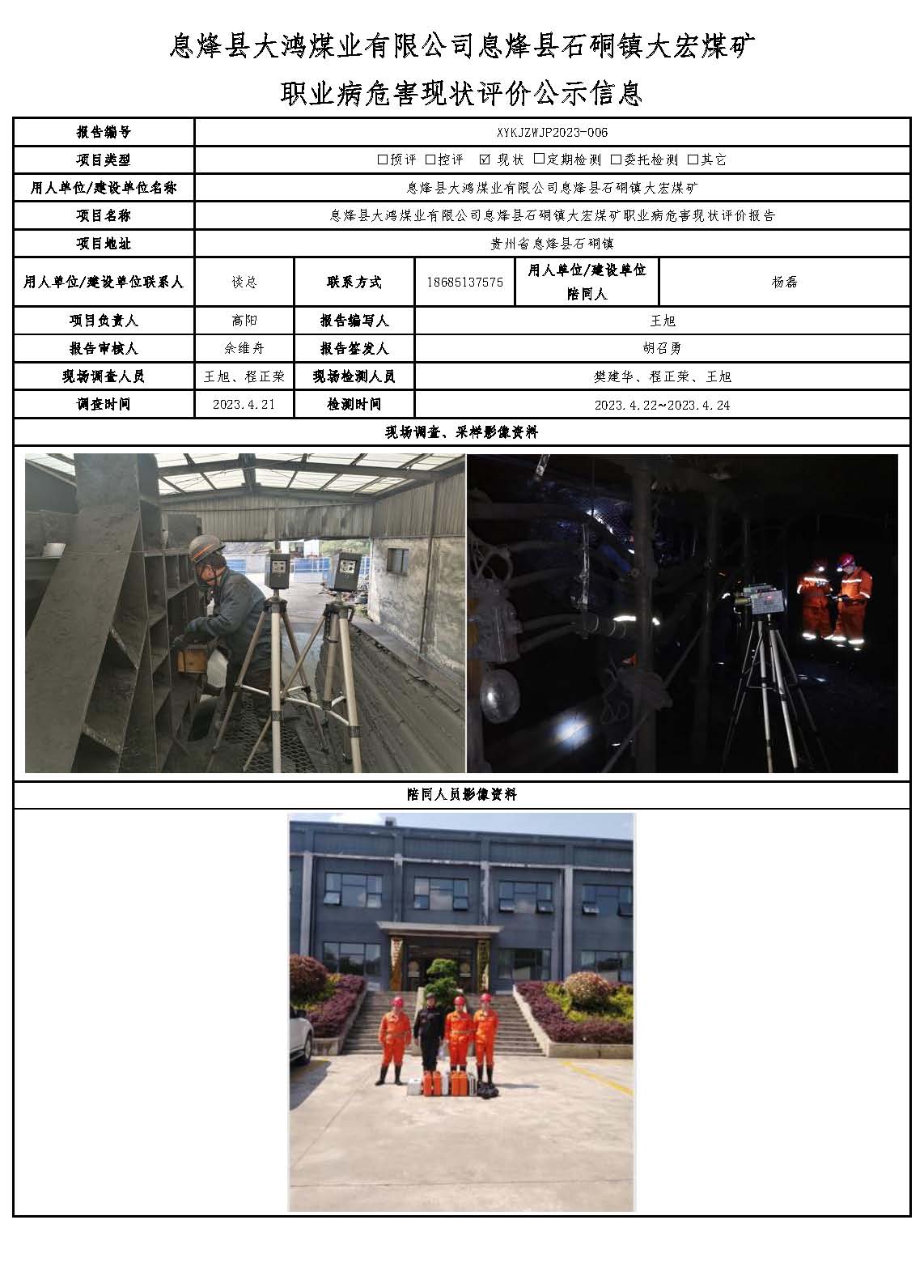 息烽縣大鴻煤業有限公司息烽縣石硐鎮大宏煤礦職業病危害現狀評價公示信息
