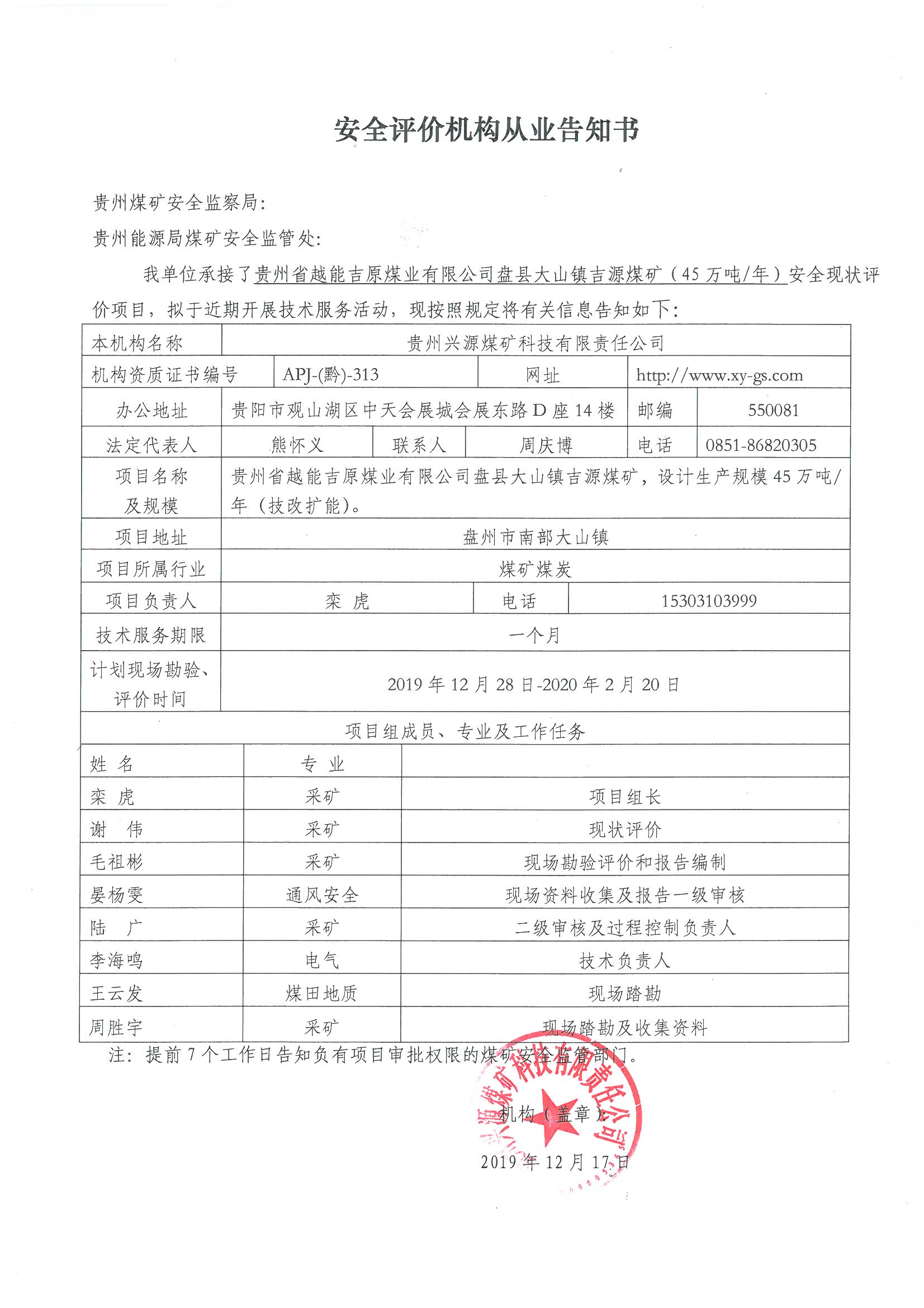 安全評價機構從業告知書[貴州省越能吉原煤業有限公司盤縣大山鎮吉源煤礦(45萬噸/年)安全現狀評價]