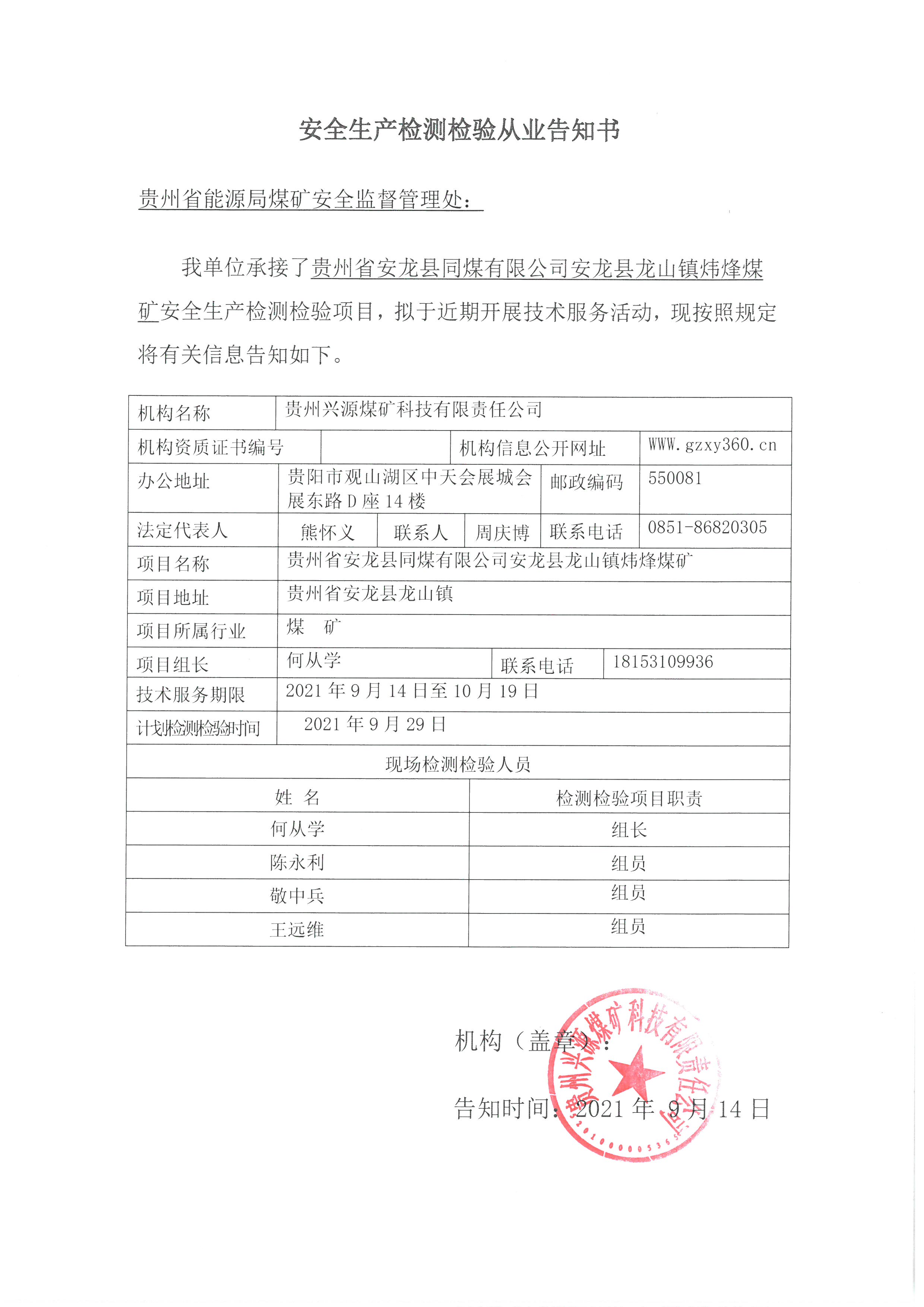 安全生產檢測檢驗從業告知書【貴州省安龍縣同煤有限公司安龍縣龍山鎮煒烽煤礦】