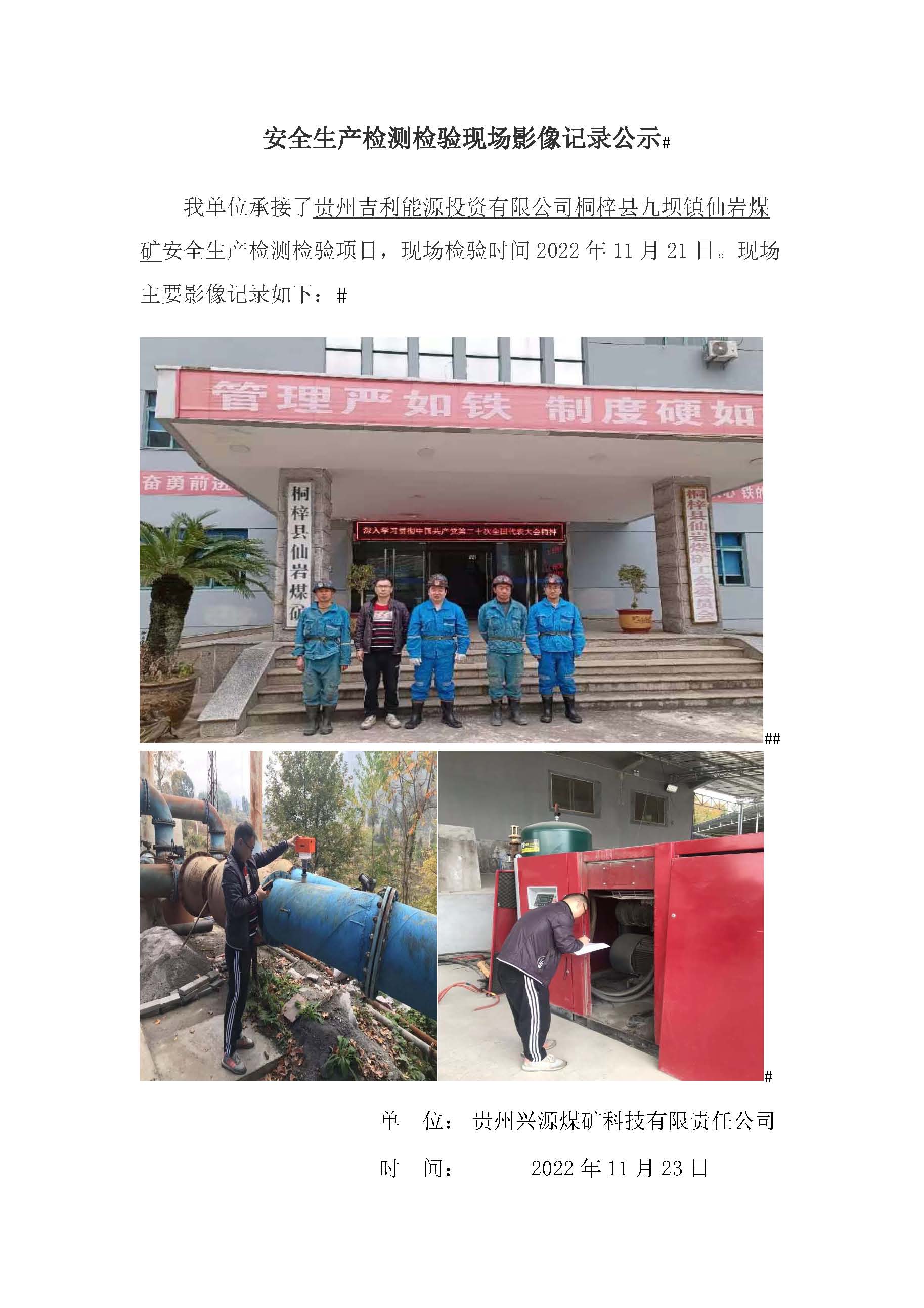 安全生產檢測檢驗現場影像記錄公示【貴州吉利能源投資有限公司桐梓縣九壩鎮仙巖煤礦】