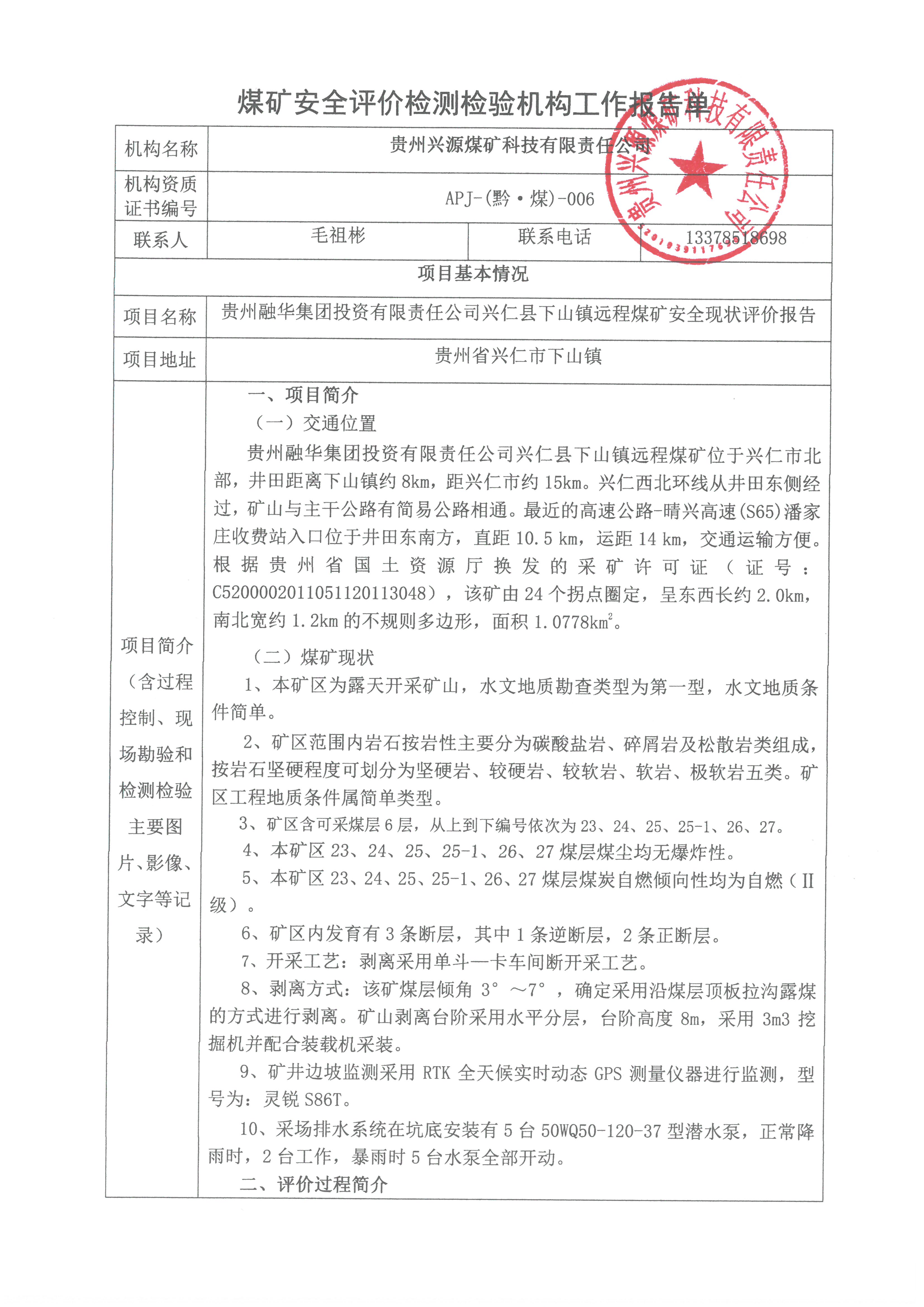 煤礦安全評價檢測檢驗機構工作報告單【貴州融華集團投資有限責任公司興仁縣下山鎮遠程煤礦安全現狀評價報告】
