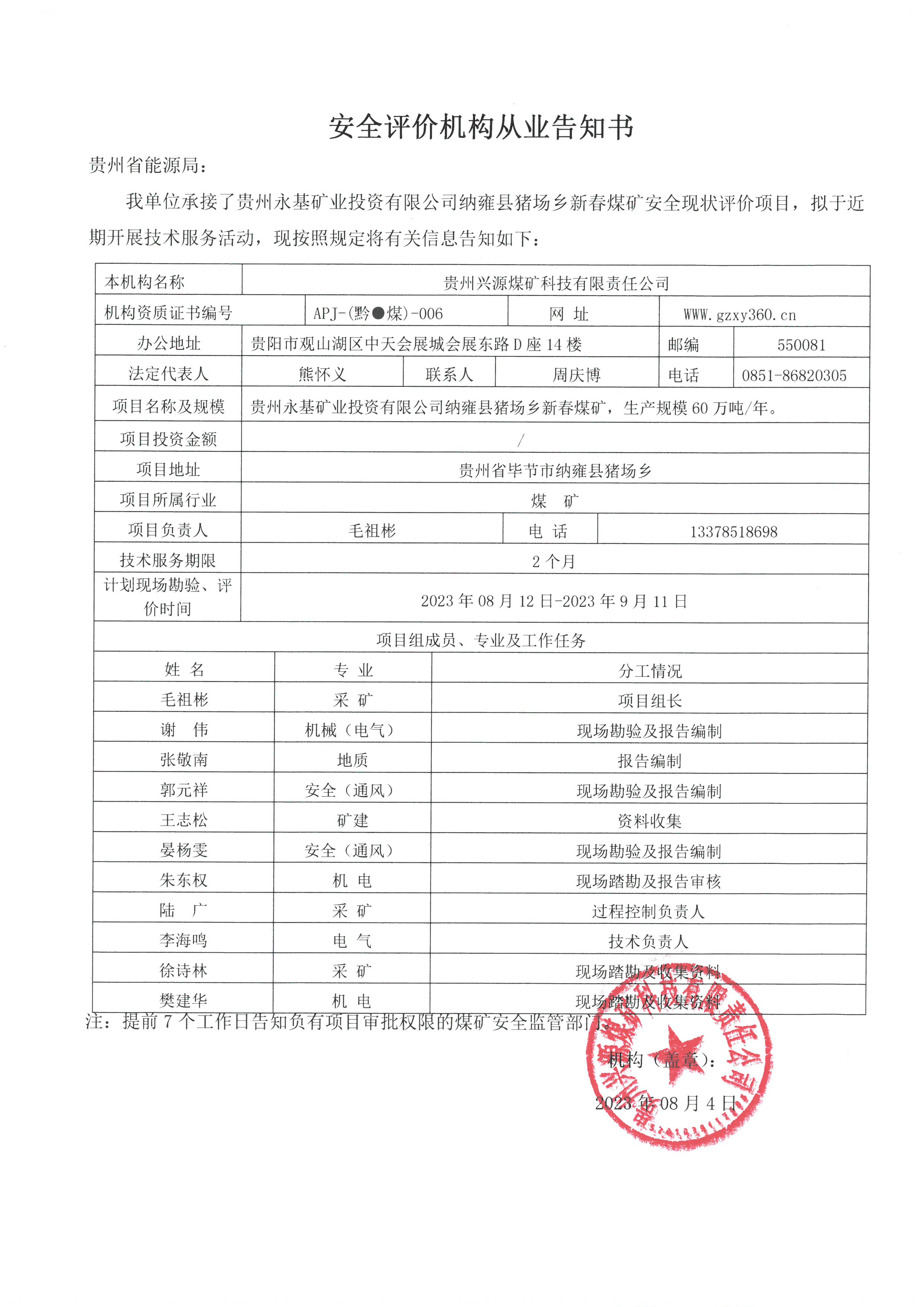 安全評價機構從業告知書【貴州永基礦業投資有限公司納雍縣豬場鄉新春煤礦】
