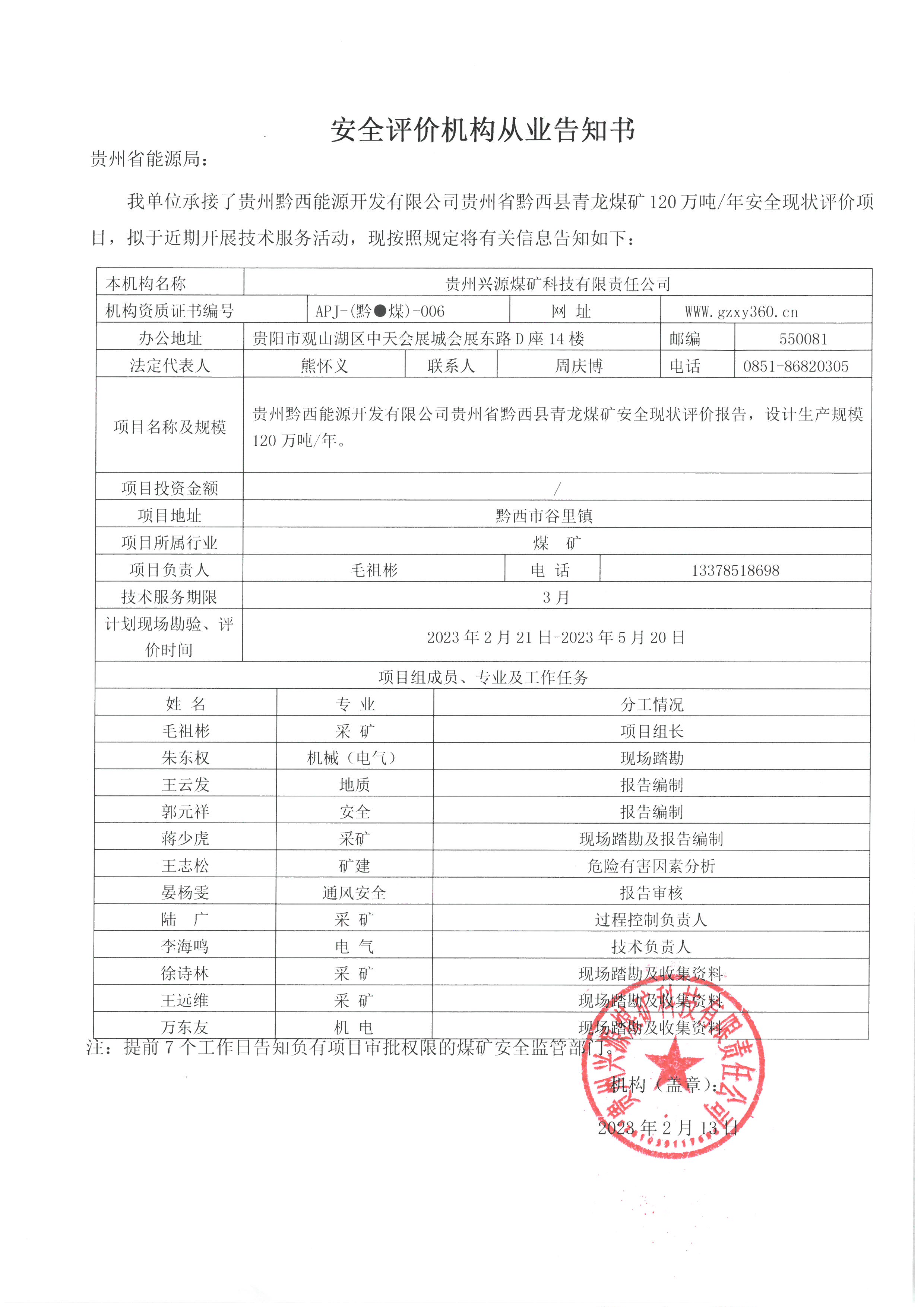 安全評價機構從業告知書(貴州黔西能源開發有限公司貴州省黔西縣青龍煤礦)