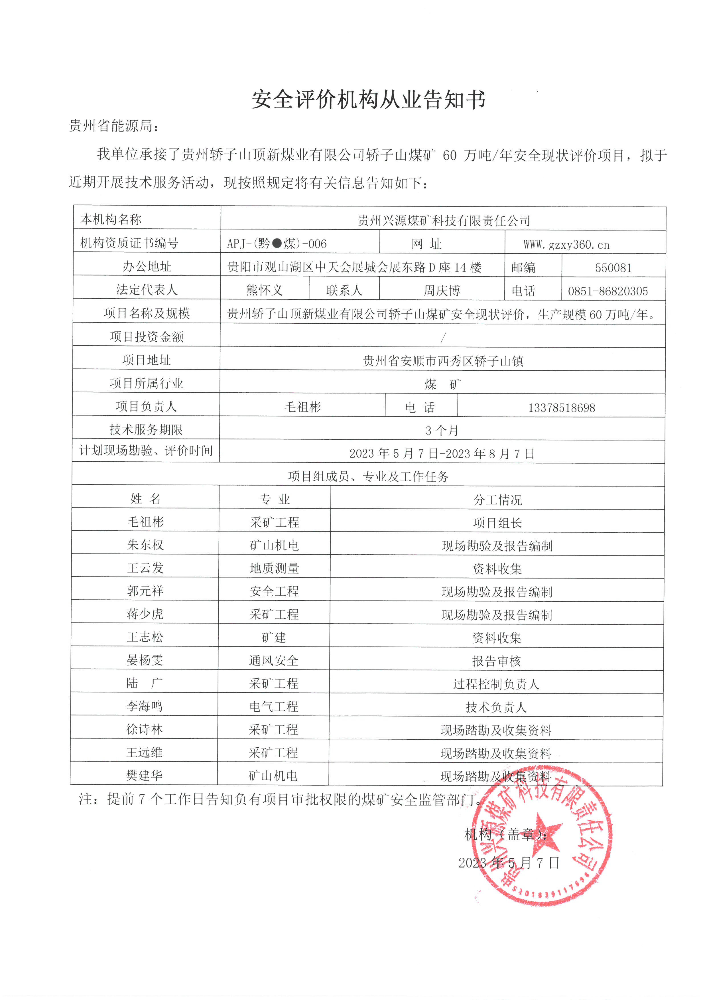 安全評價機構從業告知書【貴州轎子山頂新煤業有限公司轎子山煤礦】
