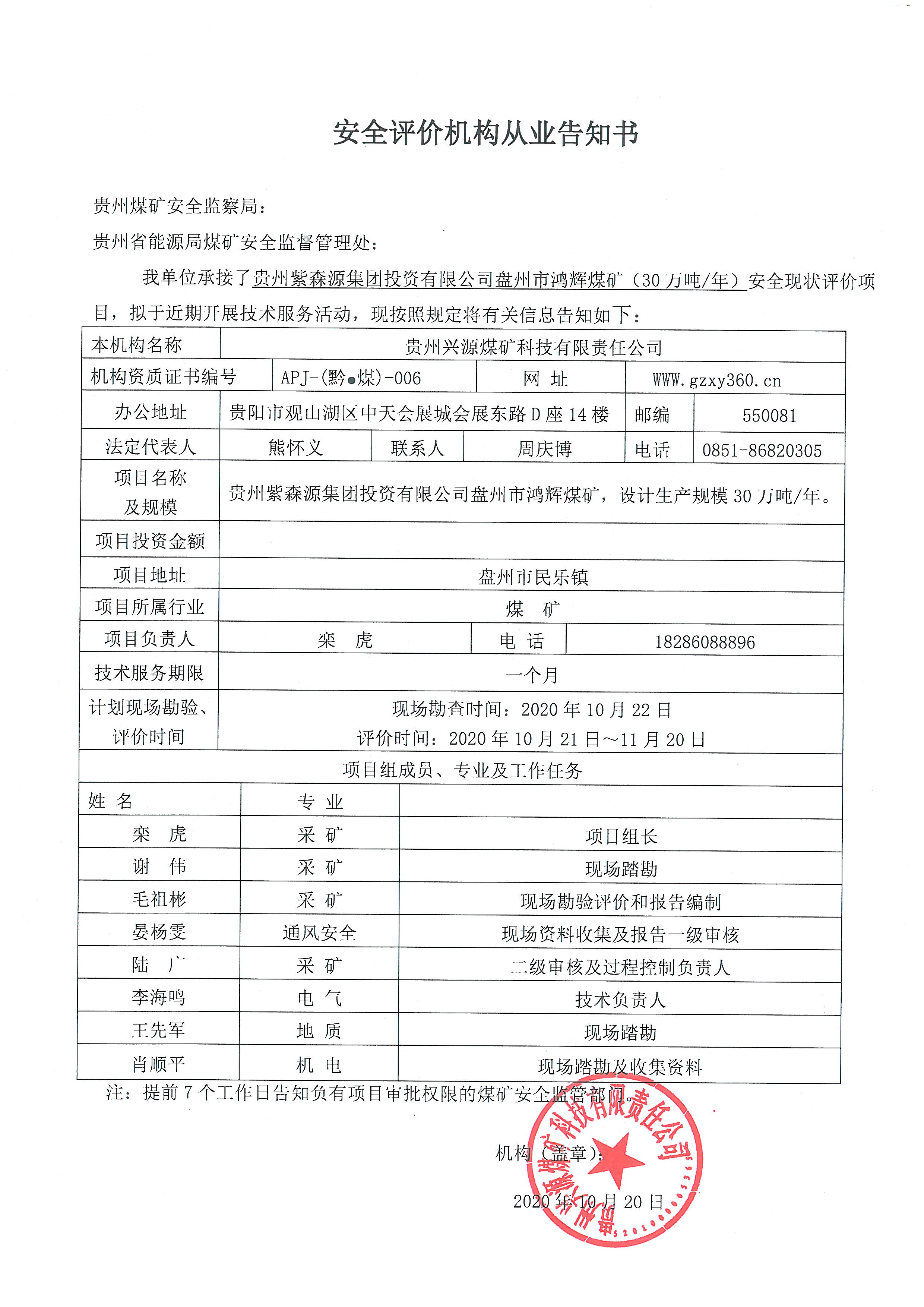 安全評(píng)價(jià)機(jī)構(gòu)從業(yè)告知書(貴州紫森源集團(tuán)投資有限公司盤州市鴻輝煤礦)