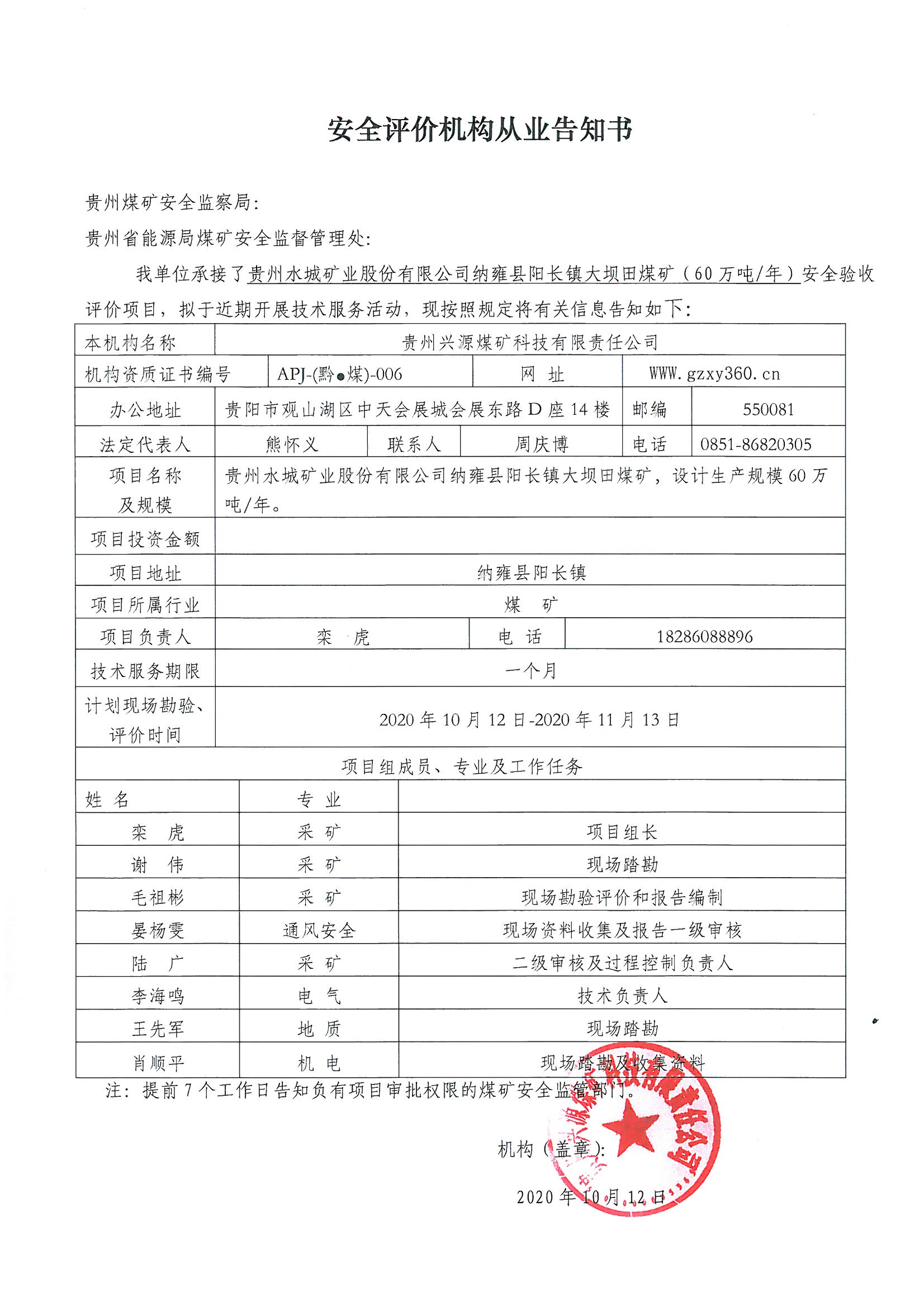 安全評價機構從業告知書(貴州水城礦業股份有限公司納雍縣陽長鎮大壩田煤礦)