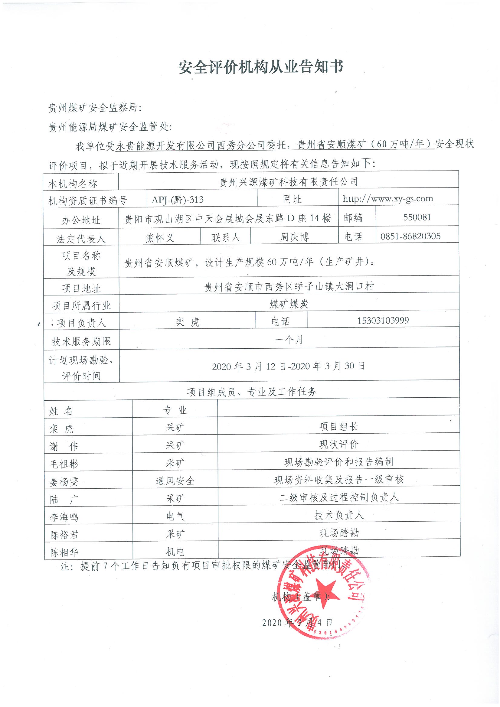 安全評價機構從業告知書[永貴能源開發有限公司西秀分公司貴州省安順煤礦(60萬噸/年)安全現狀評價]