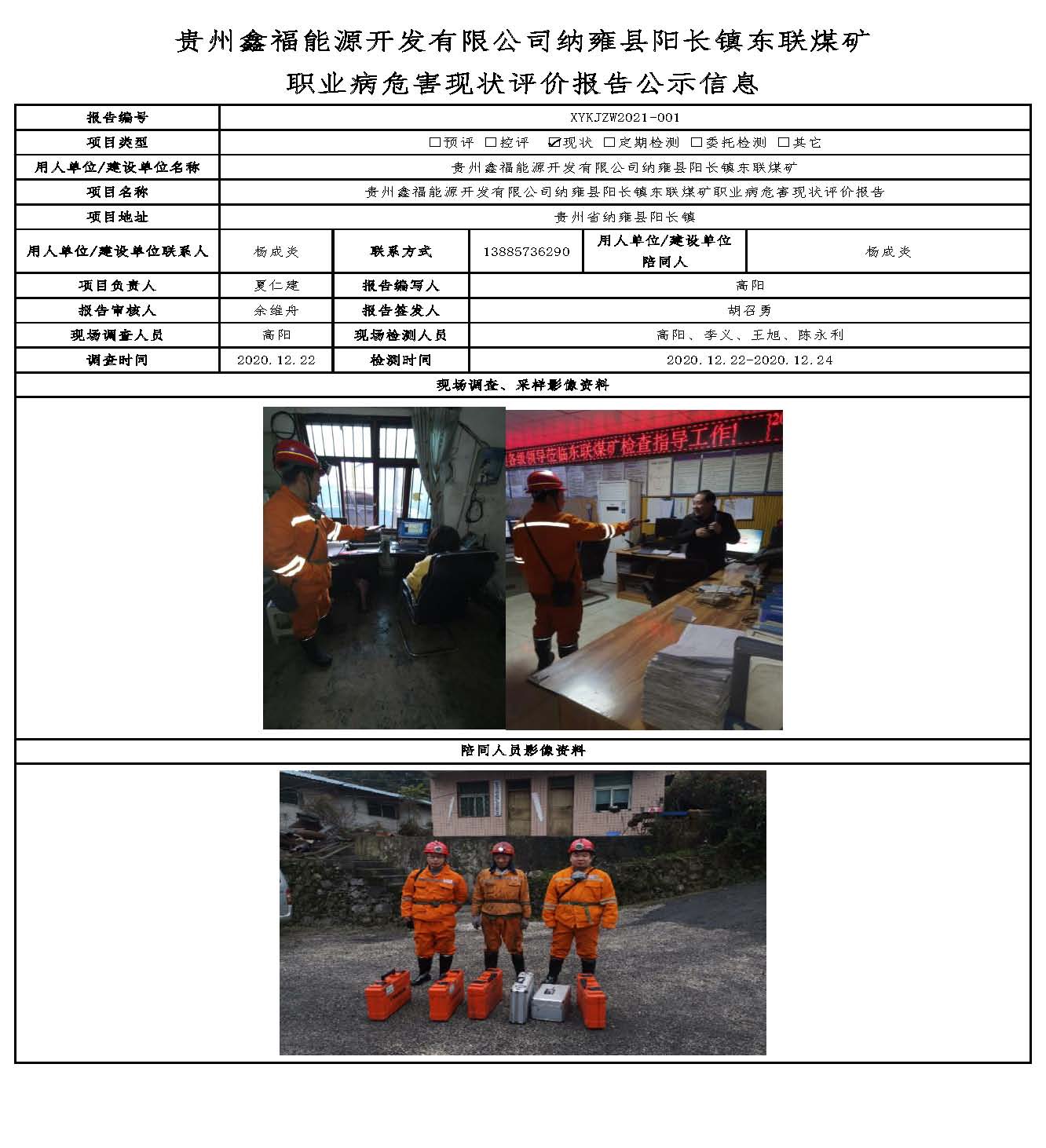 貴州鑫福能源開發有限公司納雍縣陽長鎮東聯煤礦 職業病危害現狀評價報告公示信息