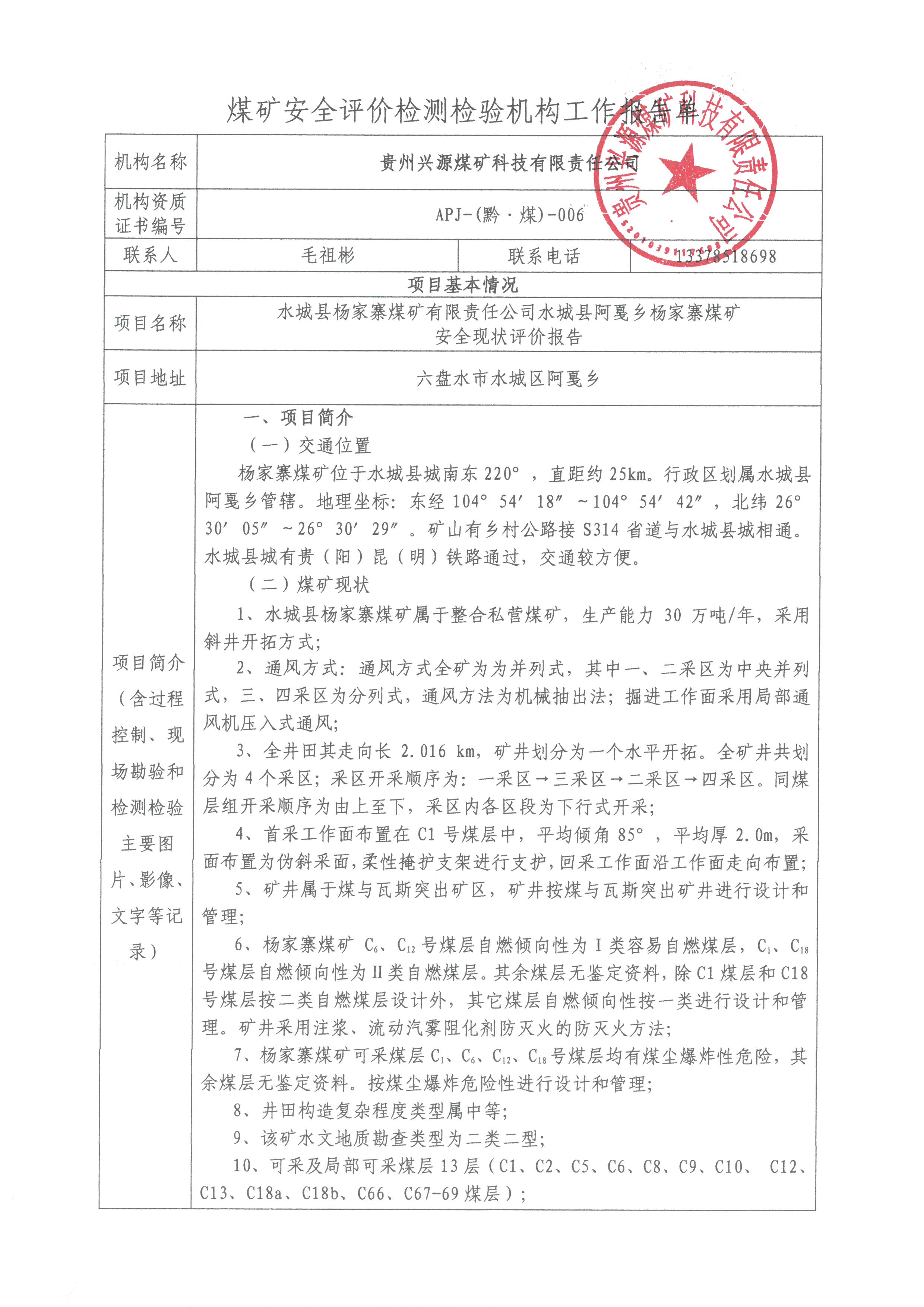 煤礦安全評價檢測檢驗機構工作報告單【水城縣楊家寨煤礦有限責任公司水城縣阿戛鄉楊家寨煤礦安全現狀評價報告】