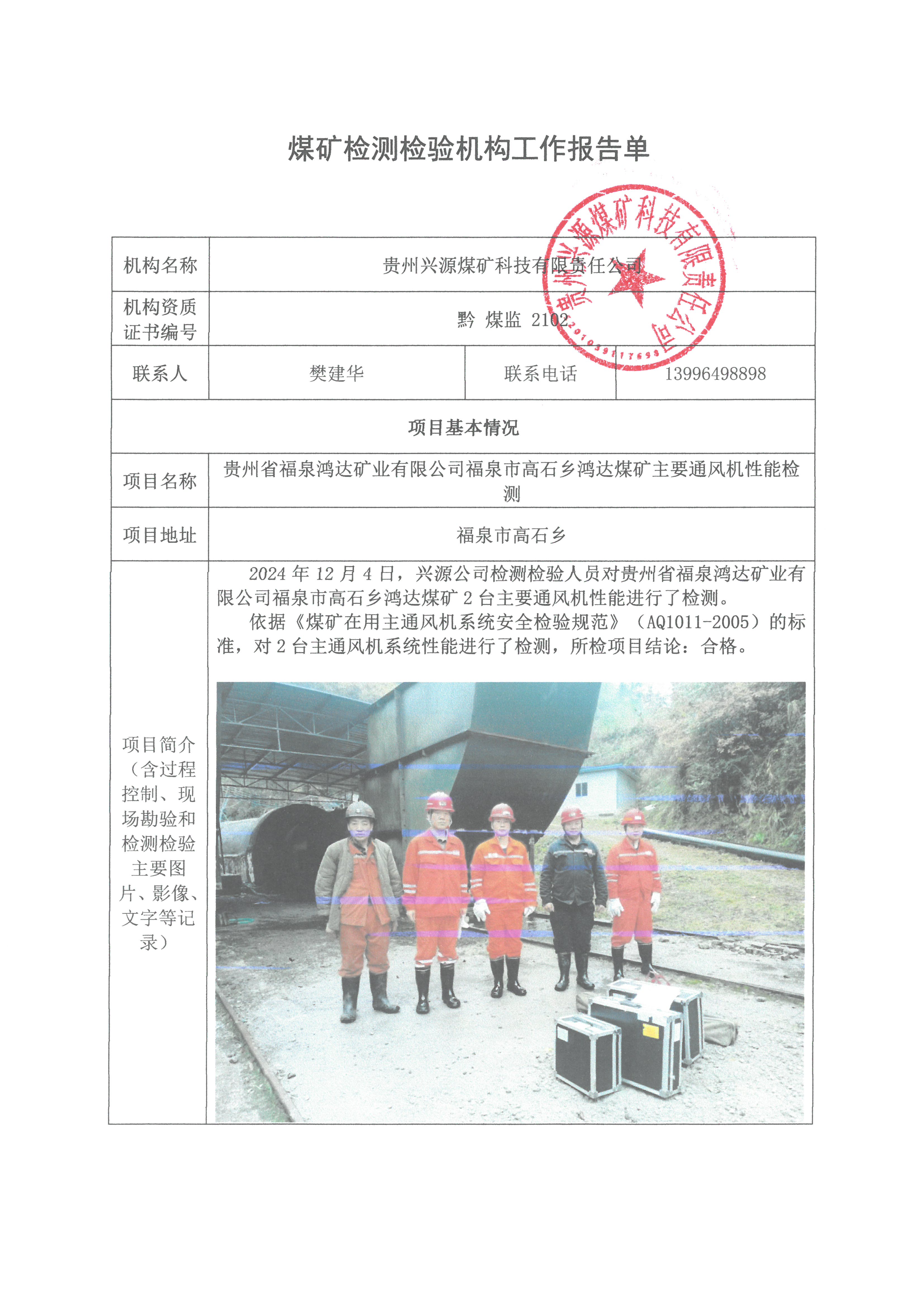 煤礦檢測檢驗機構工作報告單【貴州省福泉鴻達礦業有限公司福泉市高石鄉鴻達煤礦主要通風機性能檢測】