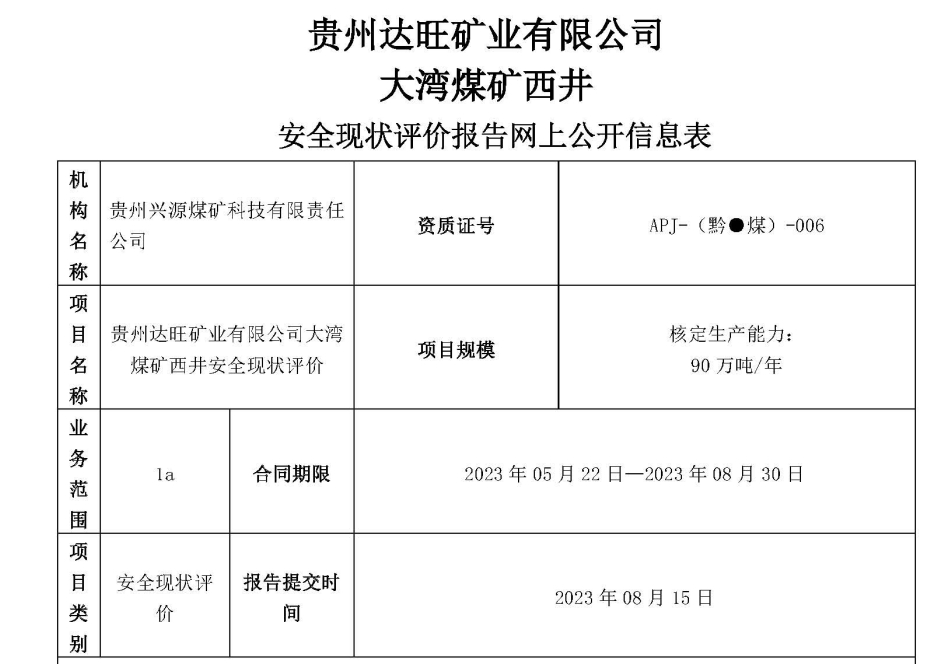 貴州達旺礦業有限公司大灣煤礦西井安全現狀評價報告網上公開信息表