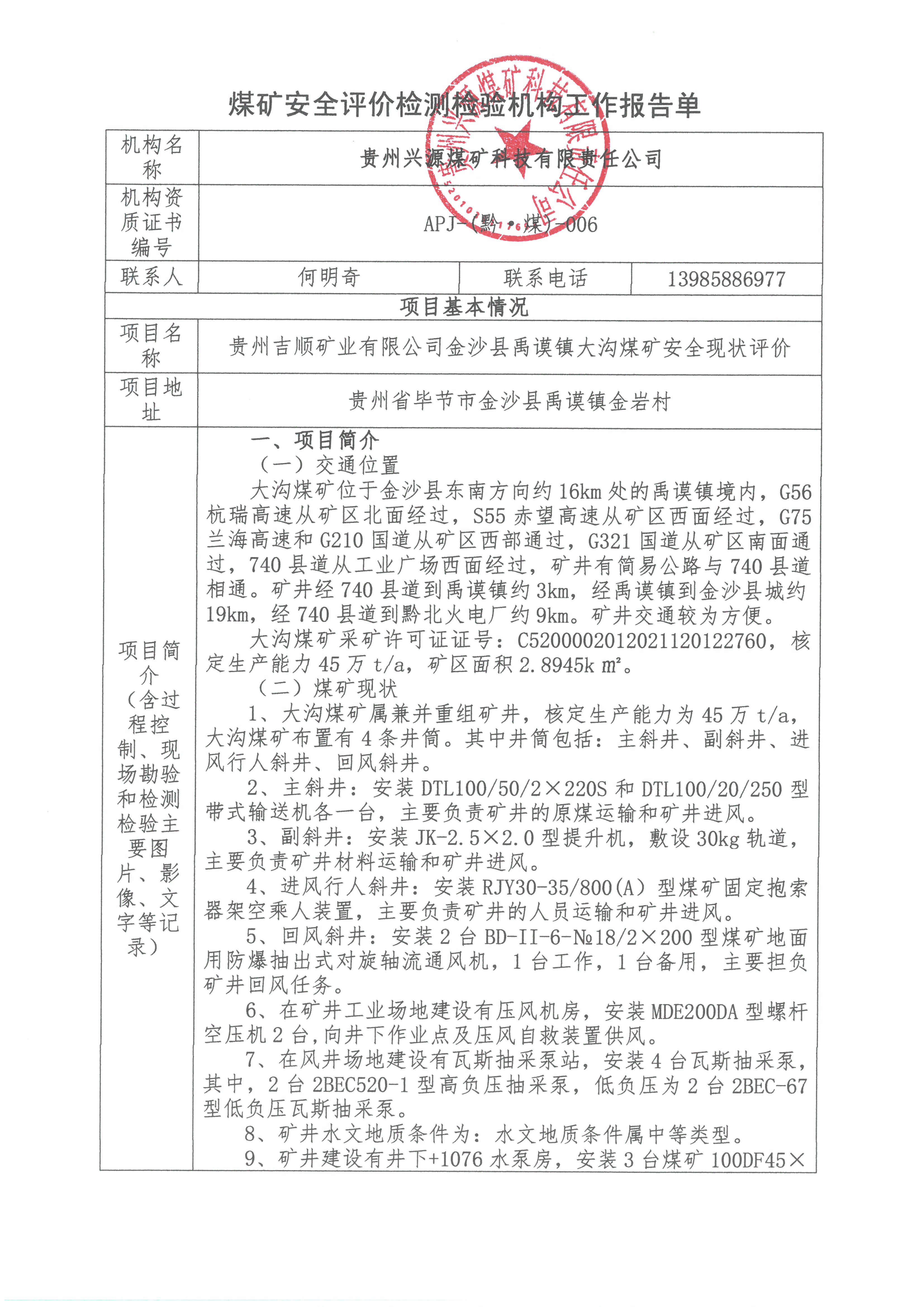 煤礦安全評價檢測檢驗機構工作報告單【貴州吉順礦業有限公司金沙縣禹謨鎮大溝煤礦安全現狀評價】