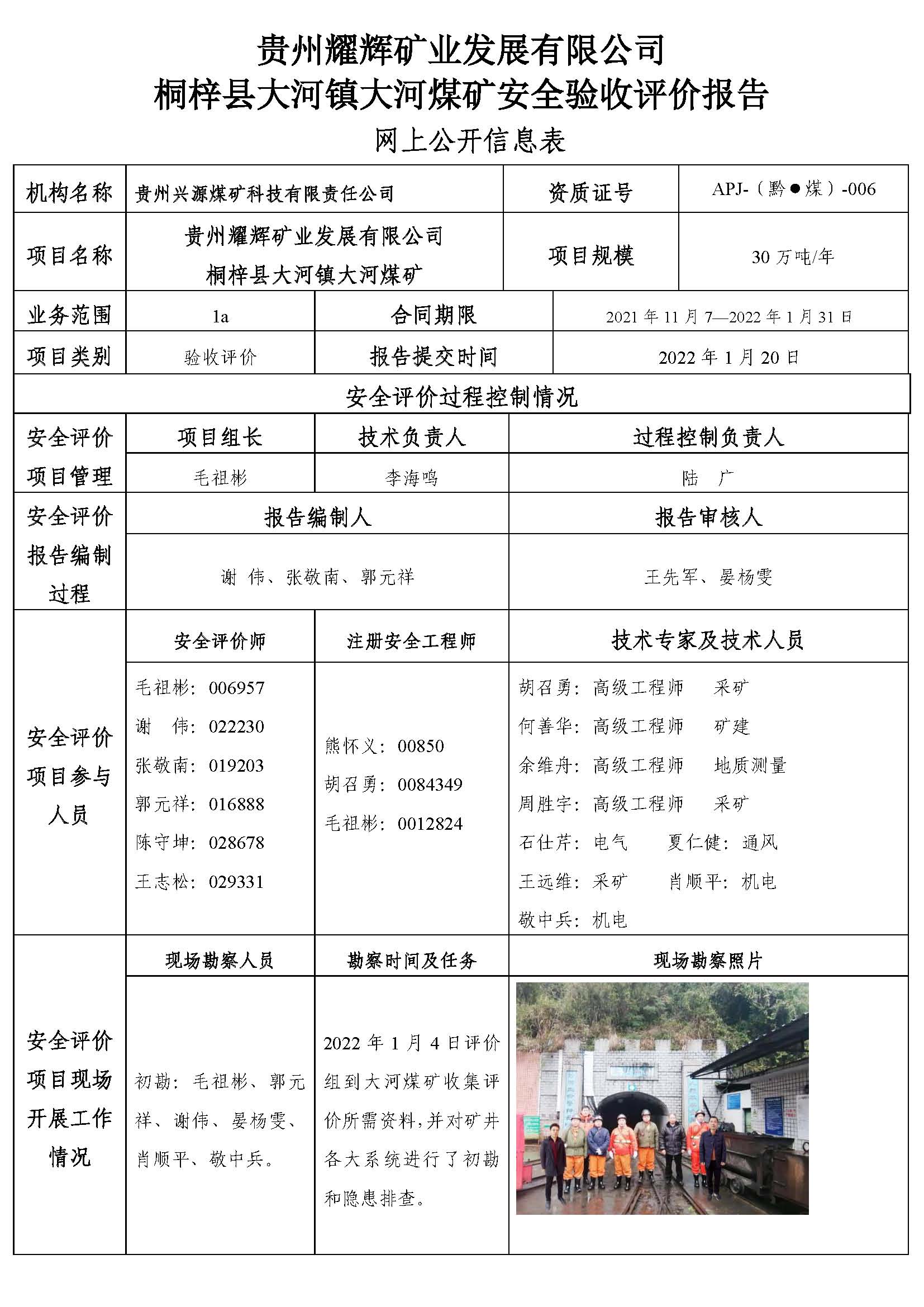 貴州耀輝礦業發展有限公司桐梓縣大河鎮大河煤礦安全驗收評價報告網上公開信息表