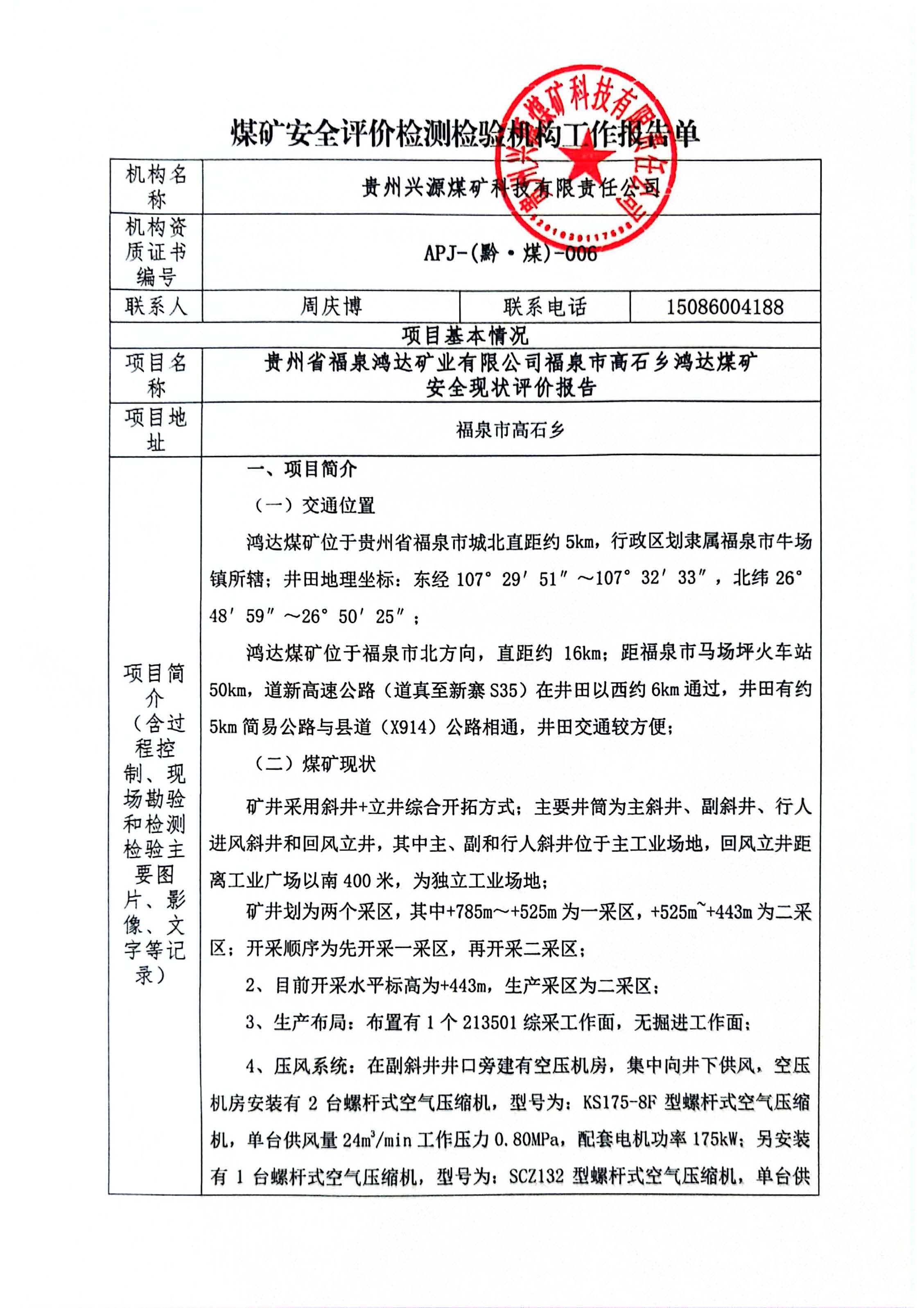 煤礦安全評價檢測檢驗機構工作報告單[貴州省福泉鴻達礦業有限公司福泉市高石鄉鴻達煤礦 安全現狀評價報告]