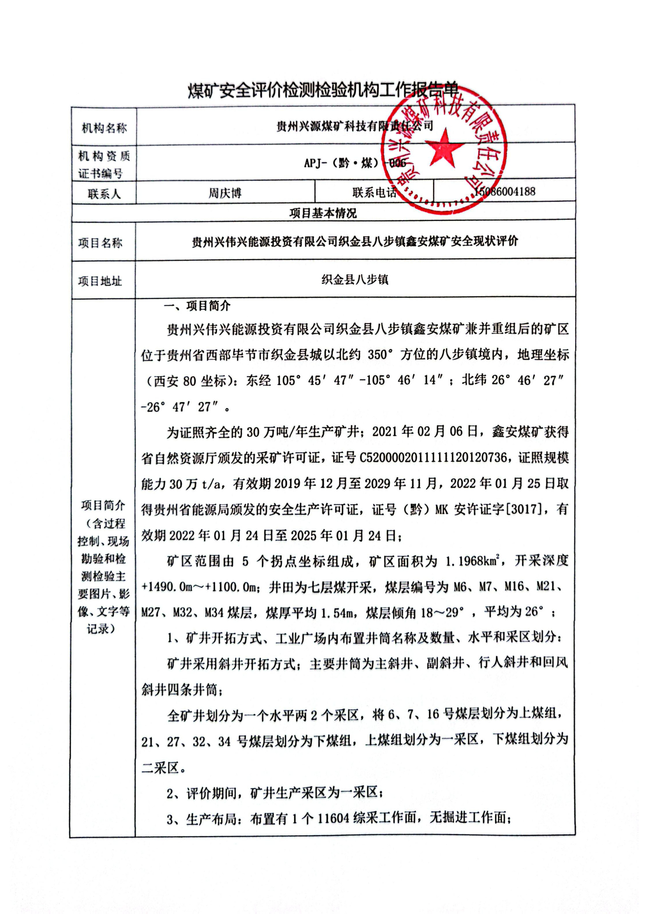 煤礦安全評價檢測檢驗機構工作報告單【貴州興偉興能源投資有限公司織金縣八步鎮(zhèn)鑫安煤礦安全現狀評價】