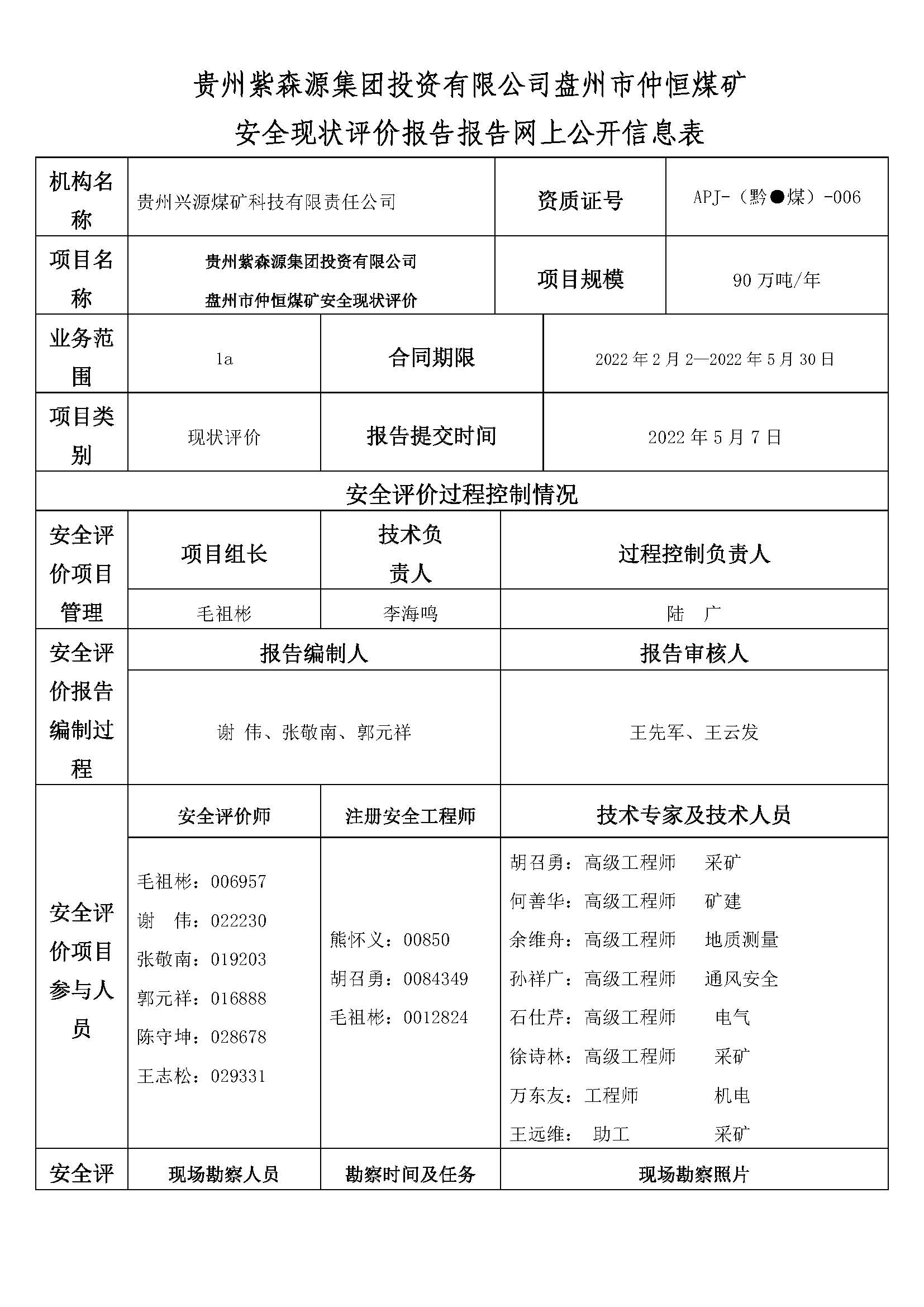 貴州紫森源集團投資有限公司盤州市仲恒煤礦安全現狀評價報告報告網上公開信息表