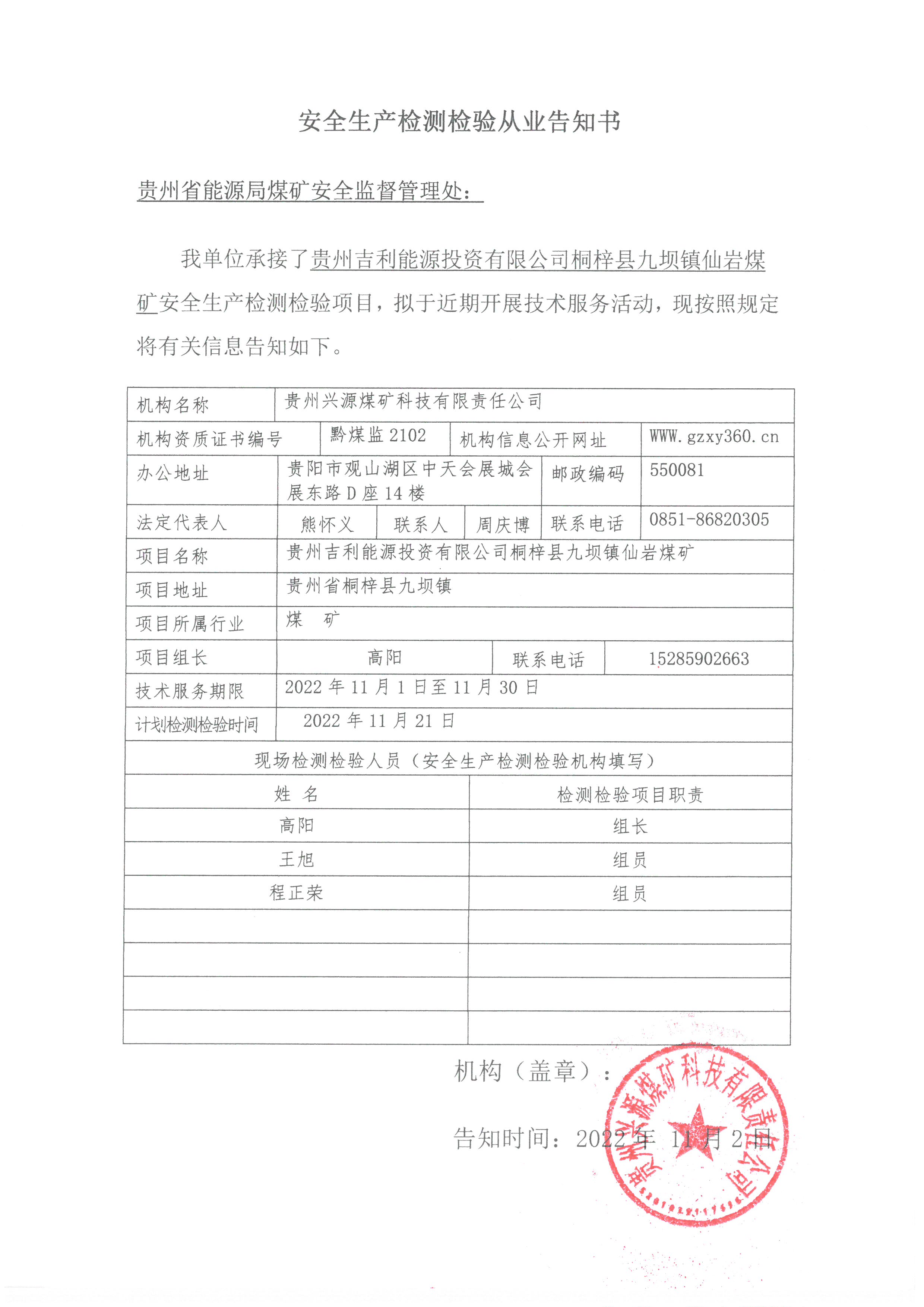 安全生產(chǎn)檢測檢驗(yàn)從業(yè)告知書【貴州吉利能源投資有限公司桐梓縣九壩鎮(zhèn)仙巖煤礦】