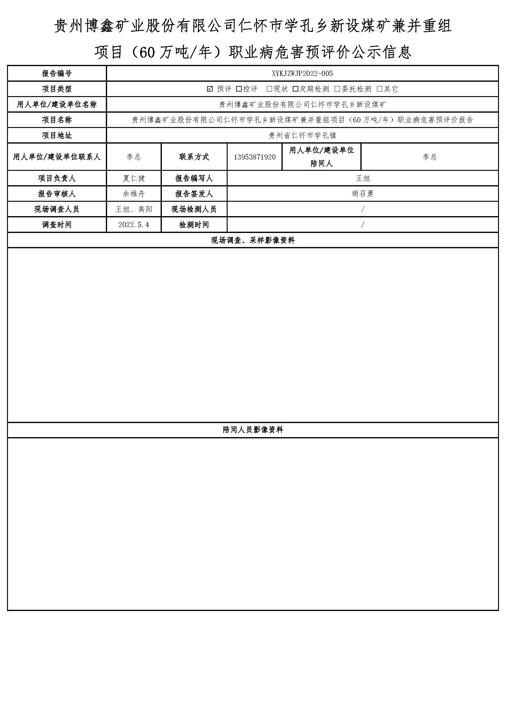 貴州博鑫礦業(yè)股份有限公司仁懷市學(xué)孔鄉(xiāng)新設(shè)煤礦兼并重組項(xiàng)目職業(yè)病危害預(yù)評價(jià)公示信息