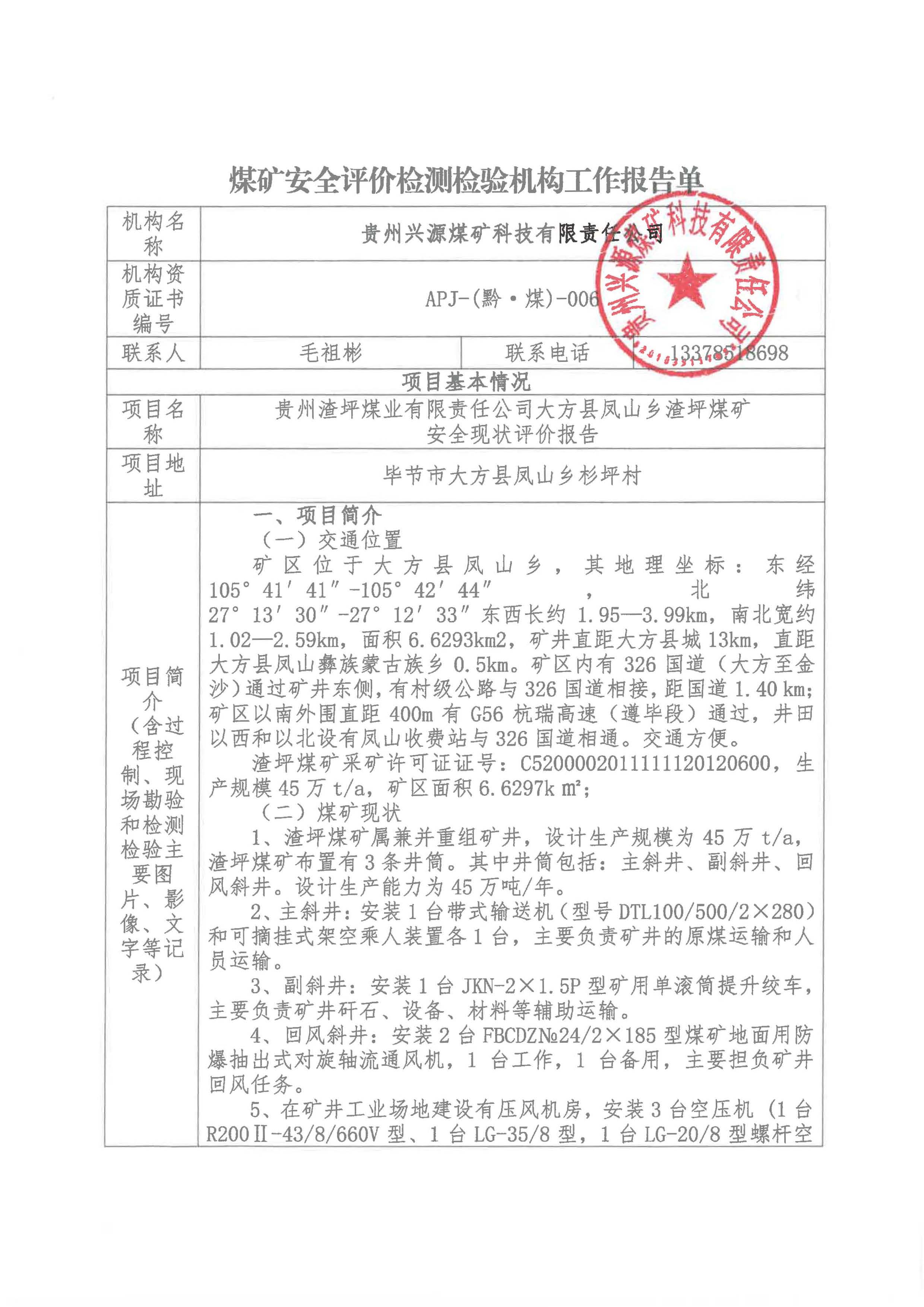 煤礦安全評價(jià)檢測檢驗(yàn)機(jī)構(gòu)工作報(bào)告單【貴州渣坪煤業(yè)有限責(zé)任公司大方縣鳳山鄉(xiāng)渣坪煤礦 安全現(xiàn)狀評價(jià)報(bào)告】