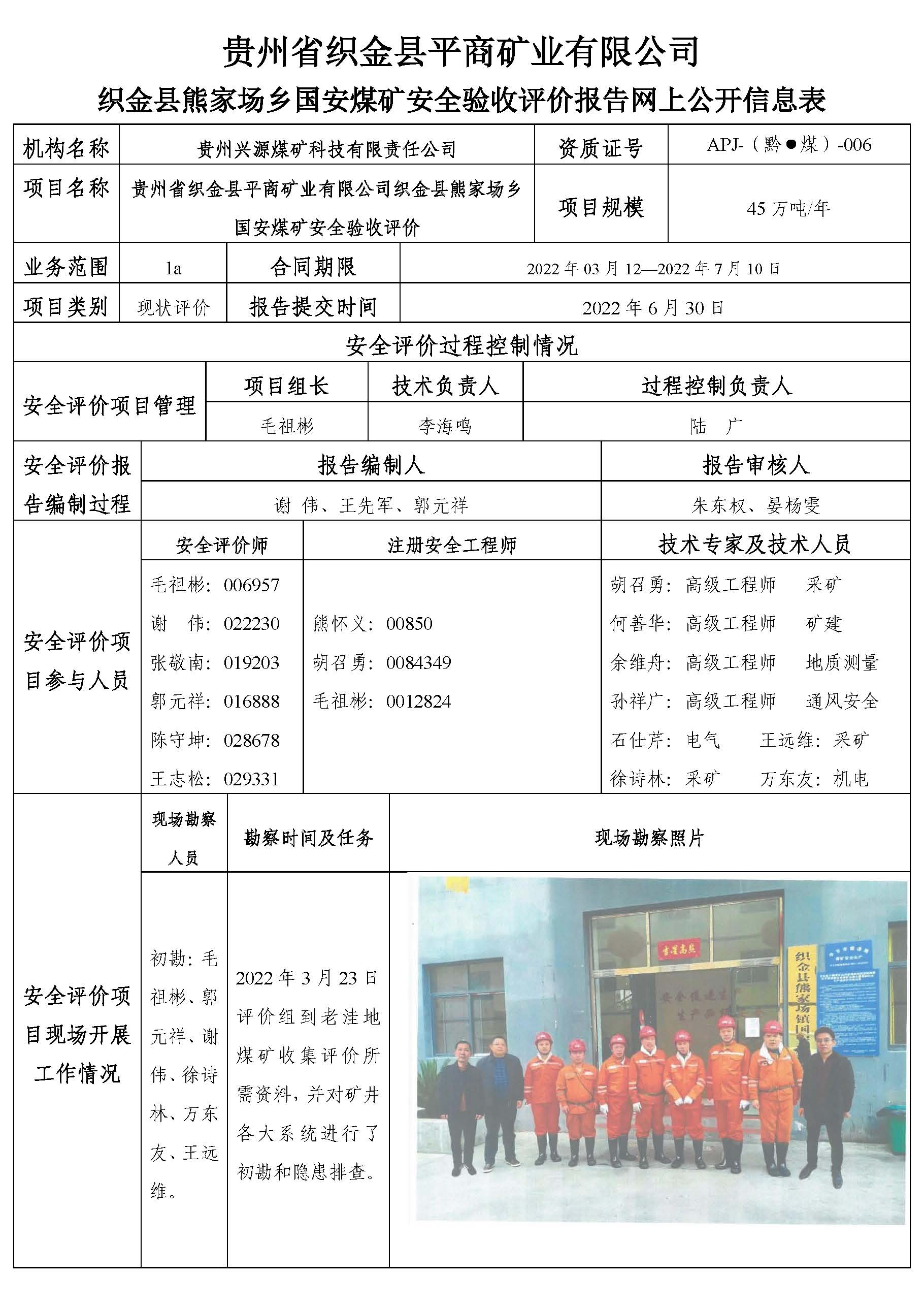 貴州省織金縣平商礦業(yè)有限公司織金縣熊家場(chǎng)鄉(xiāng)國(guó)安煤礦安全驗(yàn)收評(píng)價(jià)報(bào)告網(wǎng)上公開(kāi)信息表
