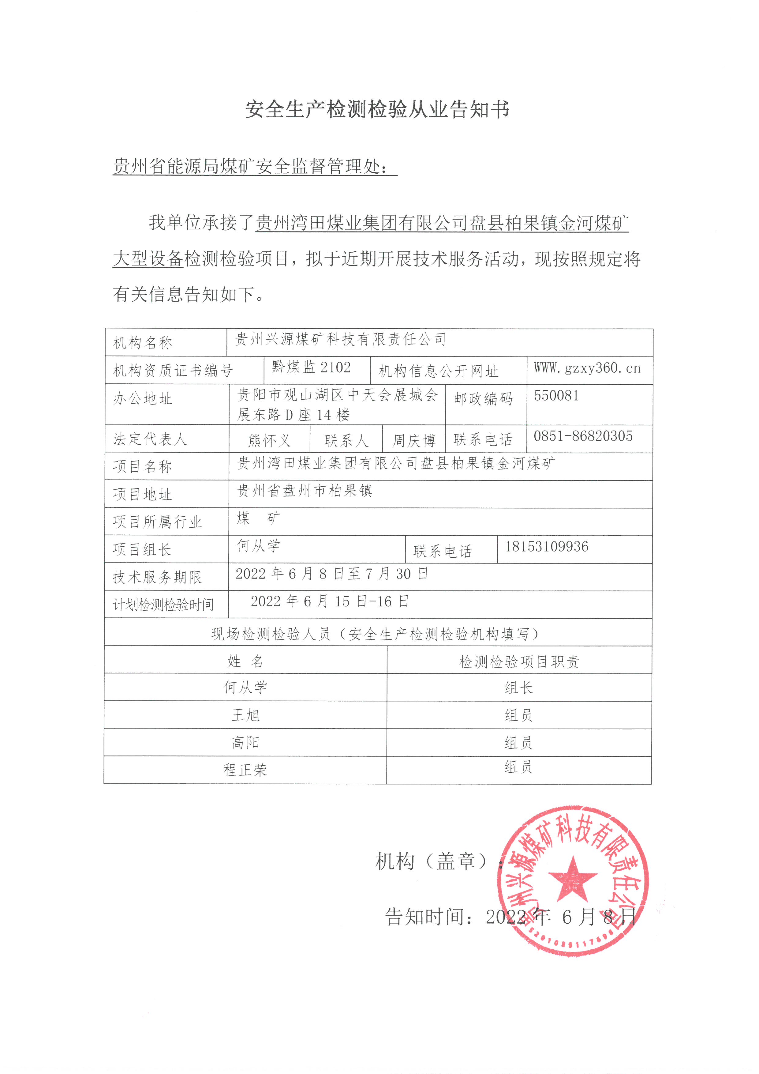 安全生產檢測檢驗從業告知書【貴州灣田煤業集團有限公司盤縣柏果鎮金河煤礦】