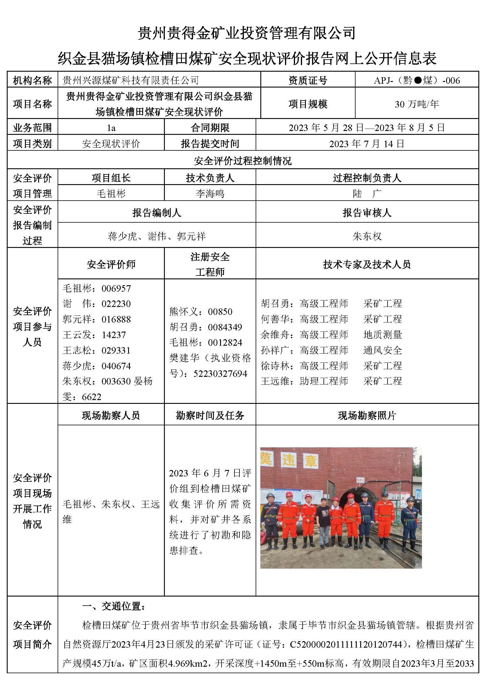貴州貴得金礦業投資管理有限公司織金縣貓場鎮檢槽田煤礦安全現狀評價報告網上公開信息表
