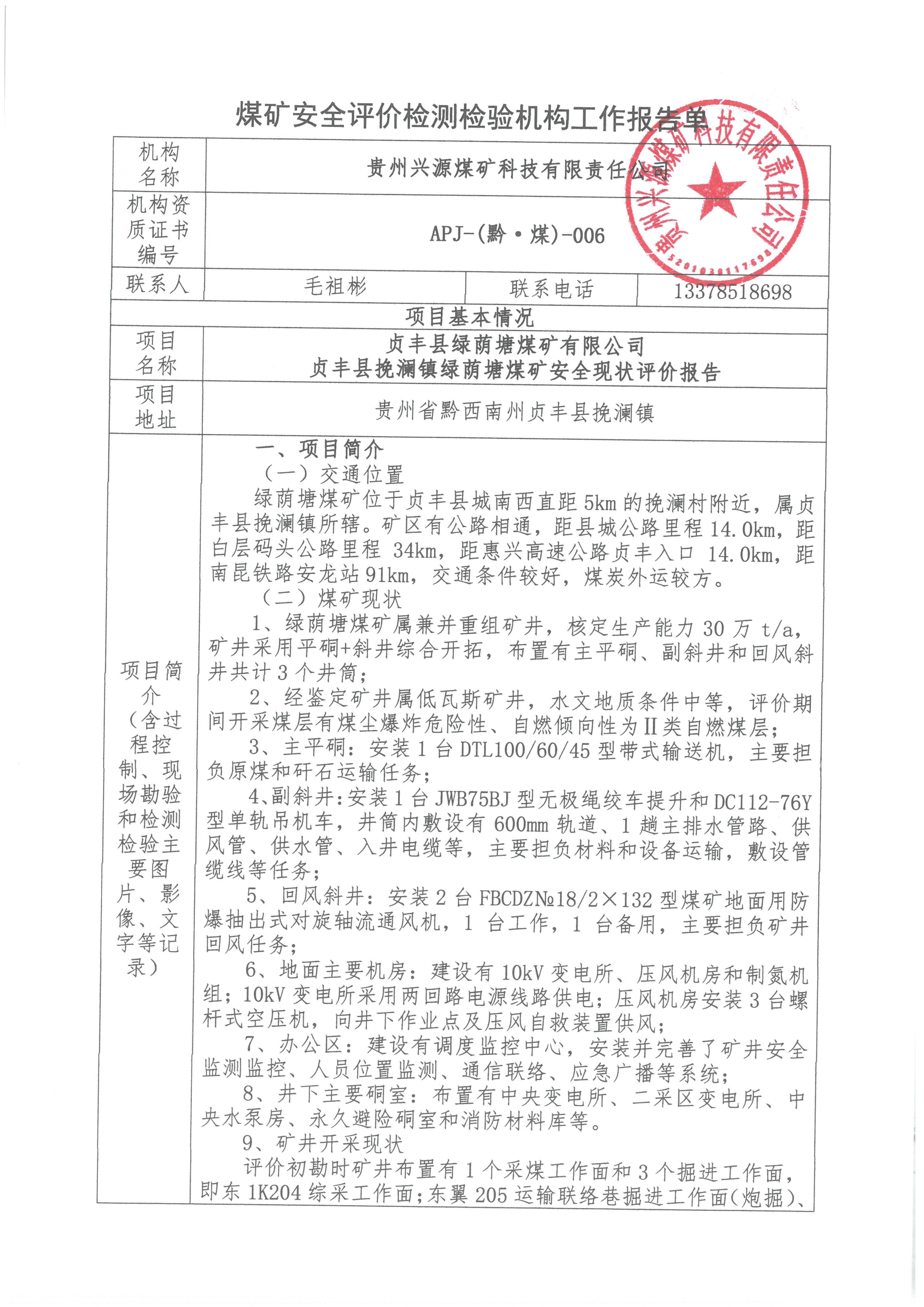 煤礦安全評價檢測檢驗機構工作報告單【貞豐縣綠蔭塘煤礦有限公司貞豐縣挽瀾鎮綠蔭塘煤礦安全現狀評價報告】