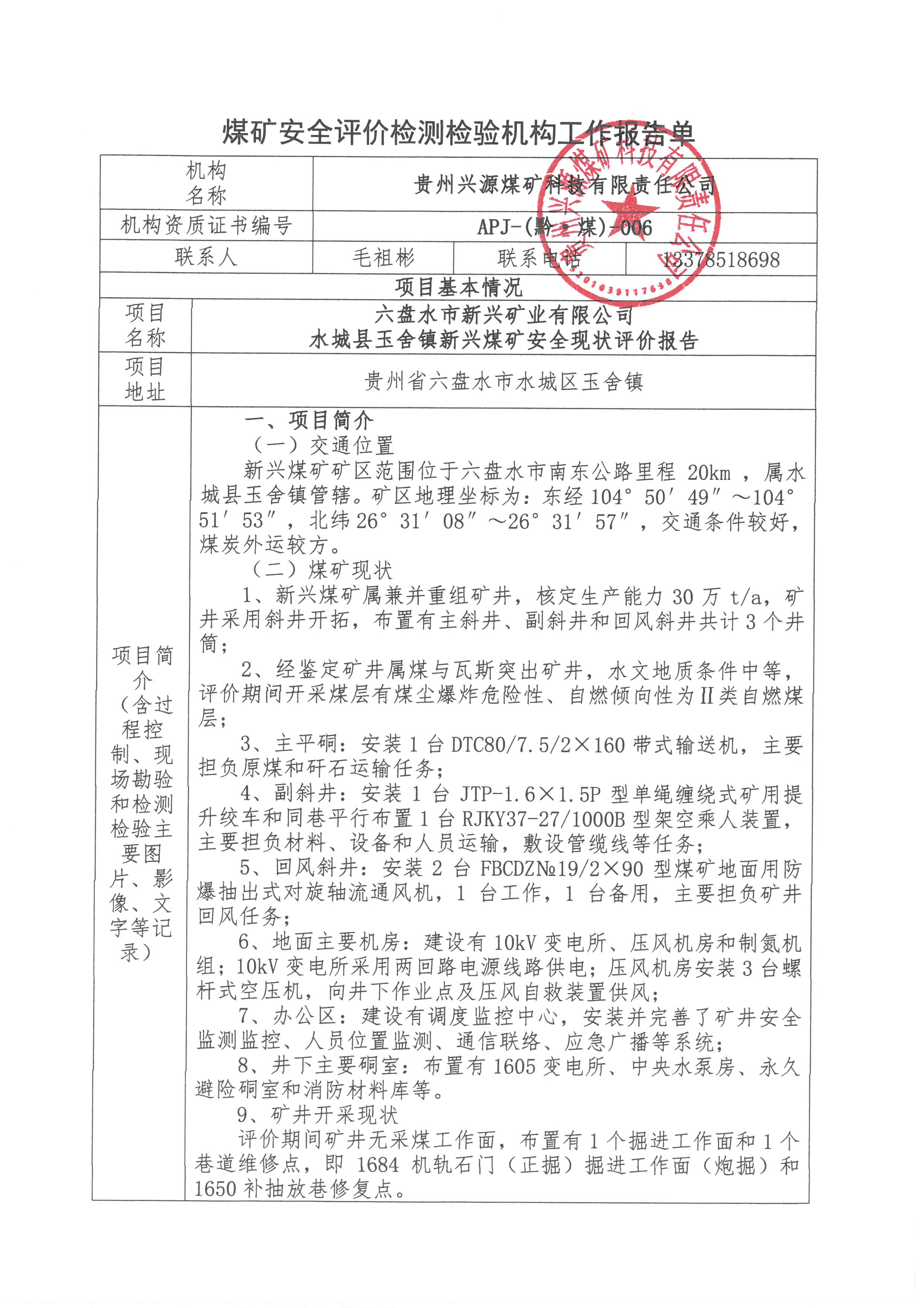 煤礦安全評價檢測檢驗機構工作報告單[六盤水市新興礦業有限公司水城縣玉舍鎮新興煤礦安全現狀評價報告]
