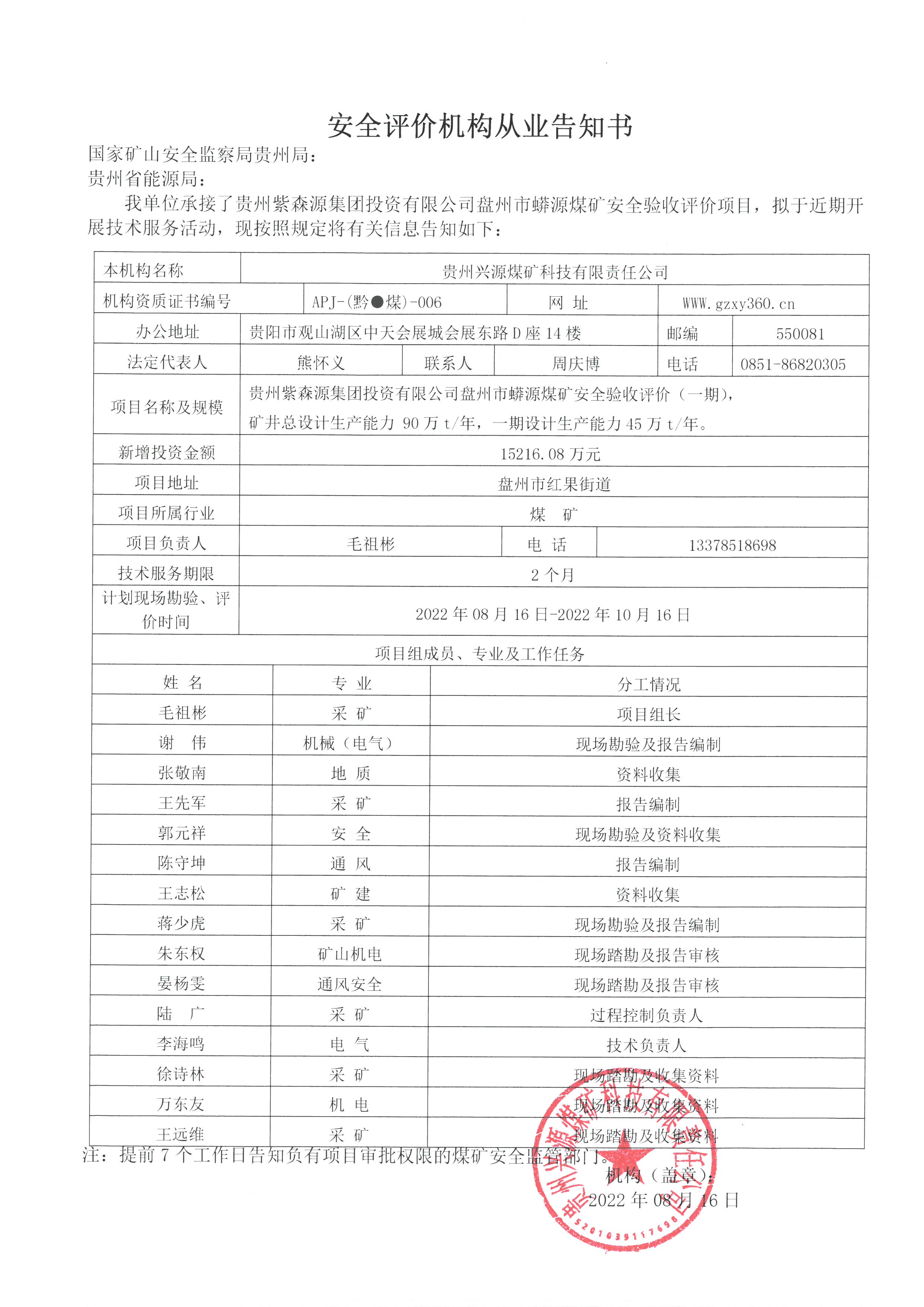 安全評價機構從業告知書【貴州紫森源集團投資有限公司盤州市蟒源煤礦】