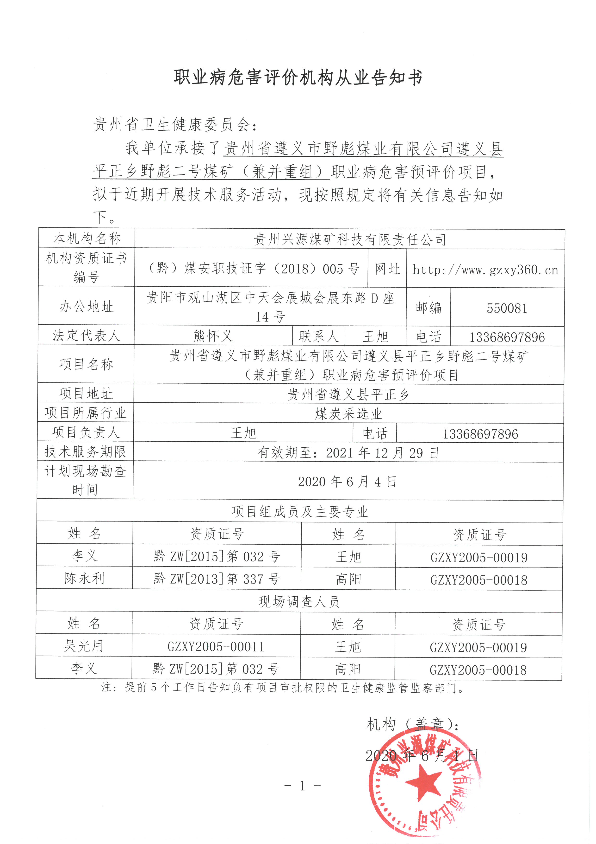 職業(yè)病危害評(píng)價(jià)機(jī)構(gòu)從業(yè)告知書(shū)【貴州省遵義市野彪煤業(yè)有限公司遵義縣平正鄉(xiāng)野彪二號(hào)煤礦(兼并重組)】