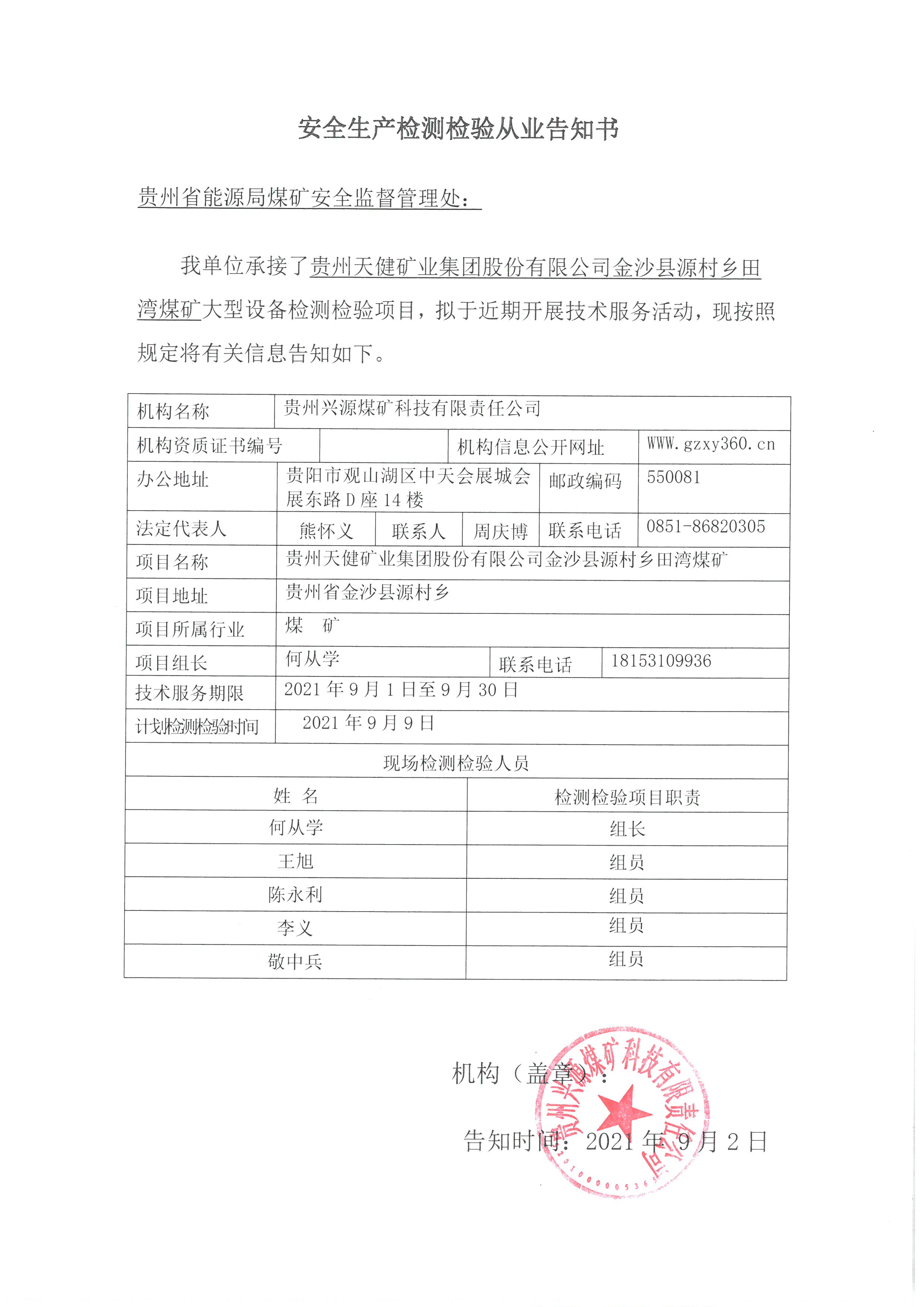 安全生產(chǎn)檢測(cè)檢驗(yàn)從業(yè)告知書(shū)【貴州天健礦業(yè)集團(tuán)股份有限公司金沙縣源村鄉(xiāng)田灣煤礦】