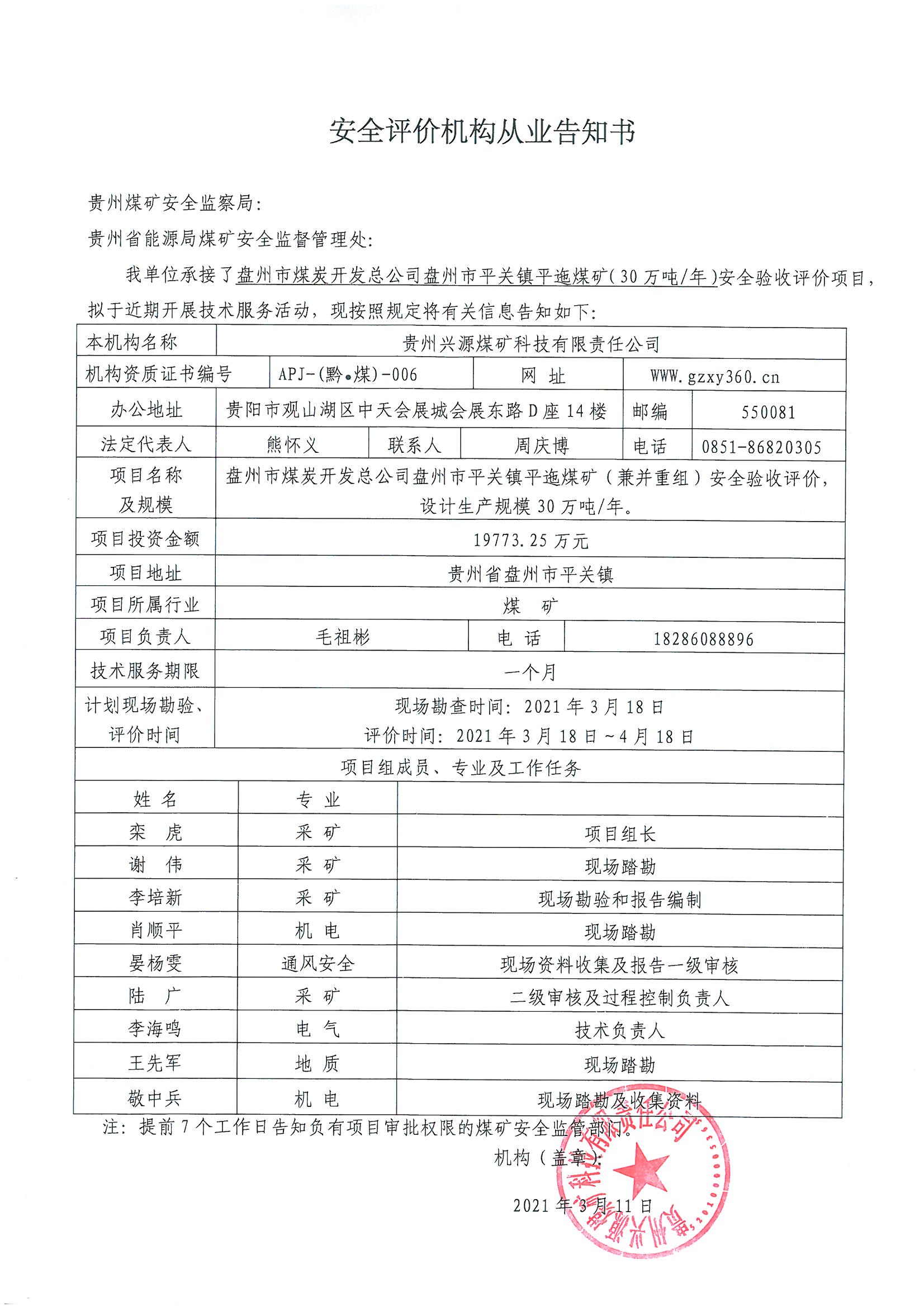 安全評價機構從業告知書(盤州市煤炭開發總公司盤州市平關鎮平迤煤礦(30萬噸年)安全驗收評價)