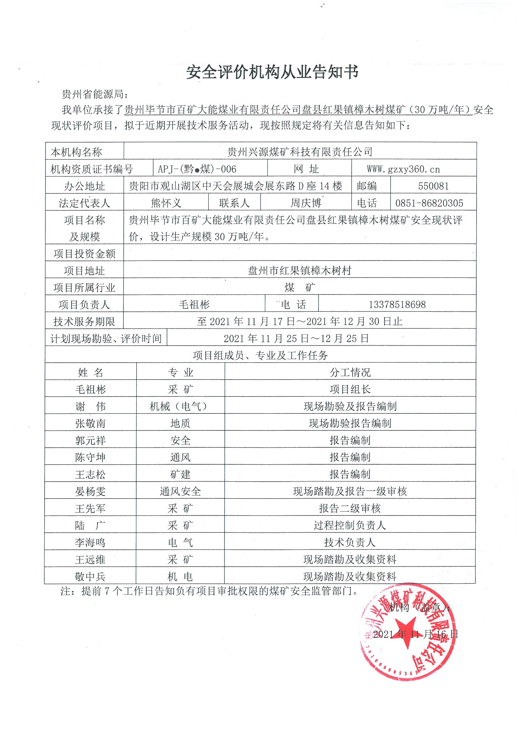 安全評價機構從業告知書(貴州畢節市百礦大能煤業有限責任公司盤縣紅果鎮樟木樹煤礦(30萬噸/年)安全現狀評價)