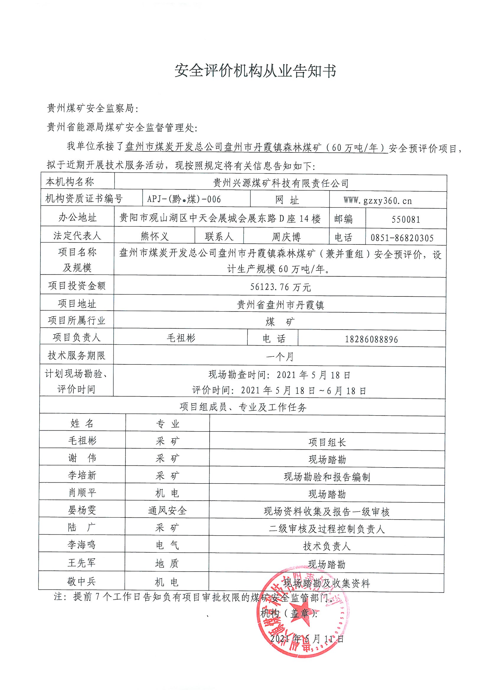 安全評價(jià)機(jī)構(gòu)從業(yè)告知書(盤州市煤炭開發(fā)總公司盤州市丹霞鎮(zhèn)森林煤礦(60萬噸年)安全預(yù)評價(jià))