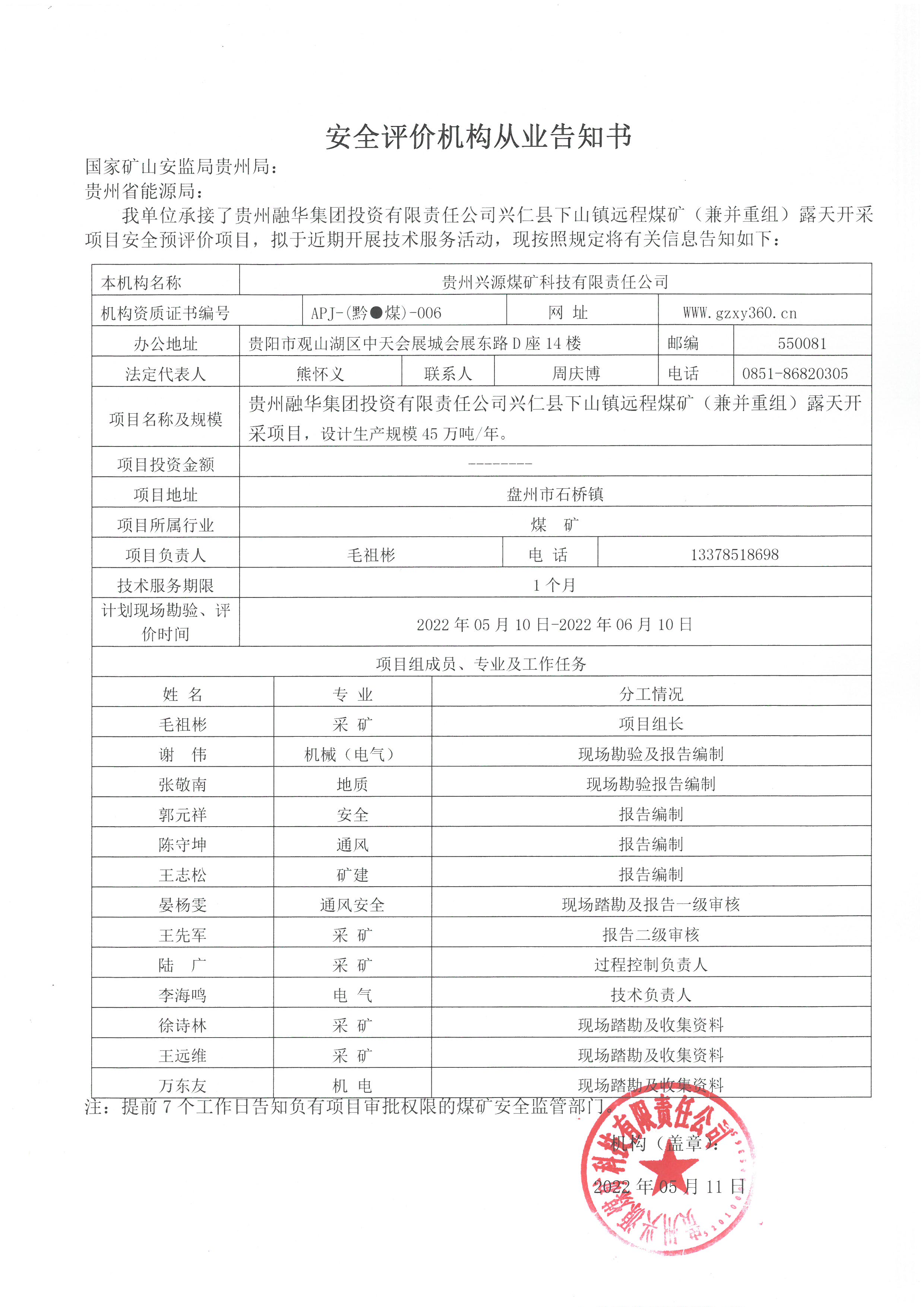 安全評價機構從業告知書(貴州融華集團投資有限責任公司興仁縣下山鎮遠程煤礦(兼并重組)露天開采項目安全預評價)
